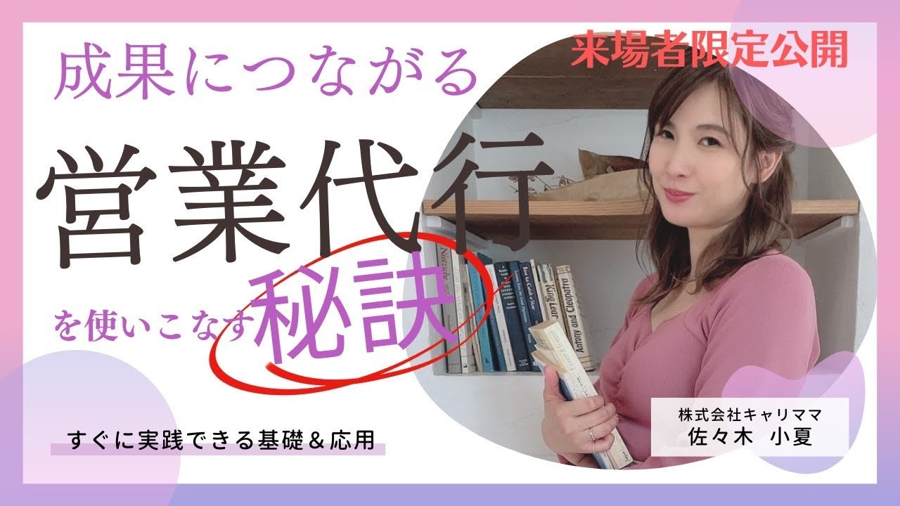 キャリママ取締役の佐々木小夏によるセミナー動画「成果につながる営業代行を使いこなす秘訣~すぐに実践できる基礎&応用~」を公開いたします。創業から500社以上への企業支援実績のあるキャリママが見つけ出した、営業代行会社をフル活用するための大事なポイントを解説します。