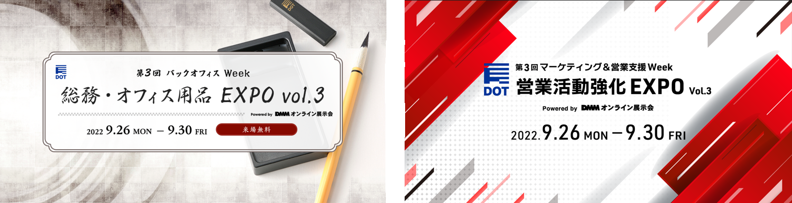 合同会社DMM.comが主催するオンライン展示会は、それぞれいくつかの専門展で構成されており、今回キャリママは「第3回バックオフィスWeek」内の「総務・オフィス用品 EXPO vol.3」と、「第3回マーケティング&営業支援Week」内の「営業活動強化 EXPO vol.3」に出展いたします。