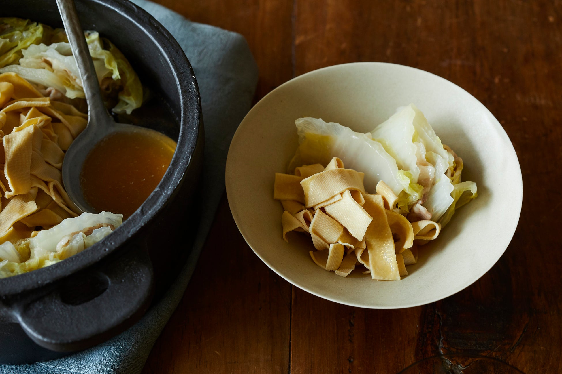 鍋料理の定番、豚バラと白菜のミルフィーユ鍋にも豆腐干を中央に乗せてボリューミーに。直径約20㎝の鍋にギュッと詰めることで、豚肉と白菜の層が崩れずにキレイに仕上がります。