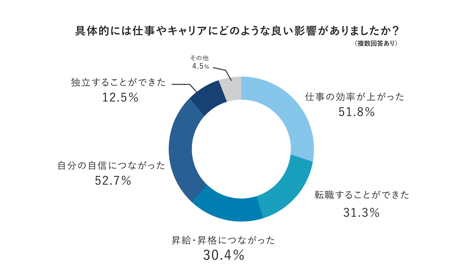 また転職や昇格に繋がった、独立できたと回答する人も一定数いることから、オンライン学習がキャリアの転換につながっていることが読み取れます。