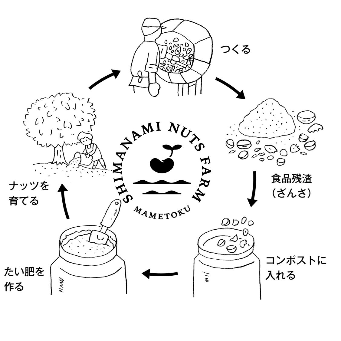 しまなみナッツファームでは、徳永製菓でナッツ・豆菓子を作る際の残渣などを一部、堆肥にしてファームに戻す循環型のモデルを模索する計画です。植物廃棄物を堆肥へアップサイクルさせます。