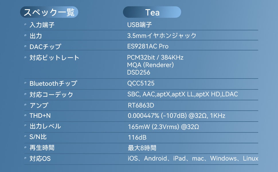 入出力端子は3.5mmジャック、USB-C端子のみとシンプルな構成になっています、内蔵バッテリー最大再生時間は8時間、デバイス側から給電ができないため充電は必要になります。