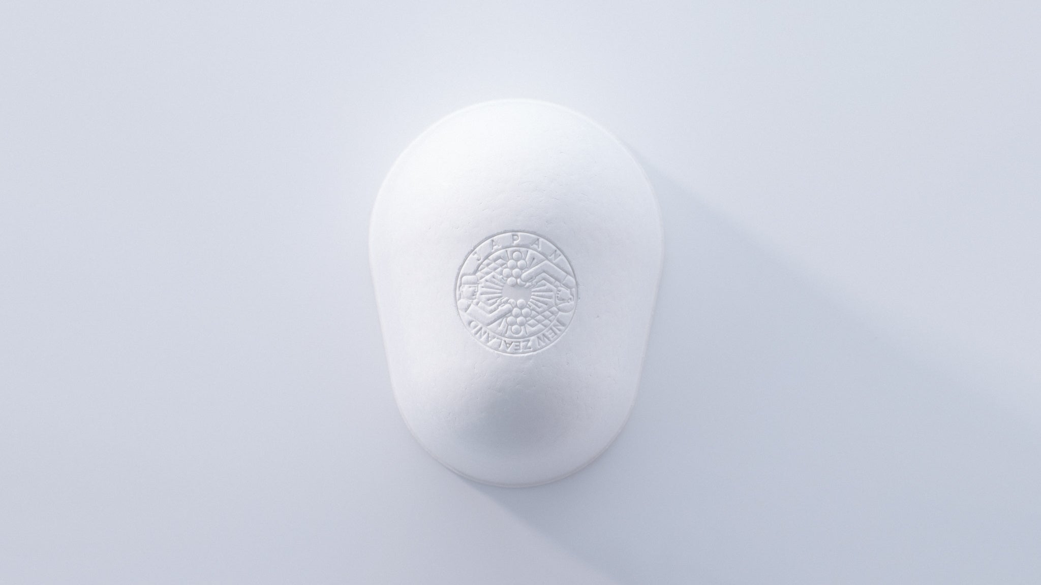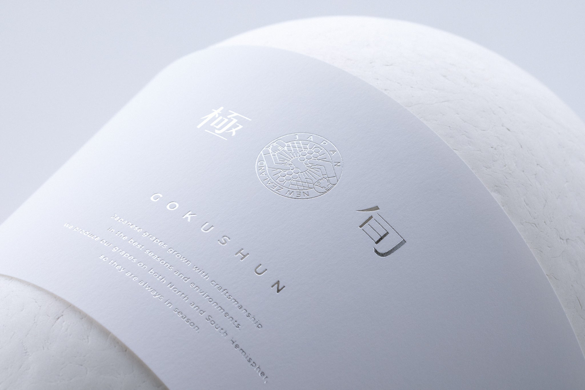 本パッケージの制作にあたり重視したことは、高級感を演出するための装飾的なデザイン要素を極力省き、ピュアで上質な極旬のぶどうの魅力を最大限に伝えることでした。パルプモールドを使用することで、ぶどうの形に沿った3Dの造形自体をデザインとし、グラフィックの要素を最小限に抑えました。その結果、ギフトとしても魅力的な、ぶどうらしい丸みを帯びた可愛らしい形状に仕上がっています。手触り感やパルプの模様、ロゴのエンボスの形状が一点一点異なるのは、まさにぶどうが一房一房それぞれに異なる個性を有していることと呼応しています。