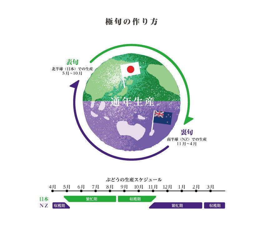三井不動産グループの事業提案制度「MAG!C」から誕生したGREENCOLLARは、季節が真逆の北半球(日本)と南半球(ニュージーランド)で高品質な日本品種の生食用ぶどうを生産し、通年で“旬を極めたぶどう「極旬」”を世界へ販売する事業を推進しております。事業を通じてホワイトカラーでもなくブルーカラーでもない、 「より人間らしく、自然と生きる=“グリーンカラー”」という、新しいライフスタイルを実現するとともに、新たな農業のかたちを提案しております。