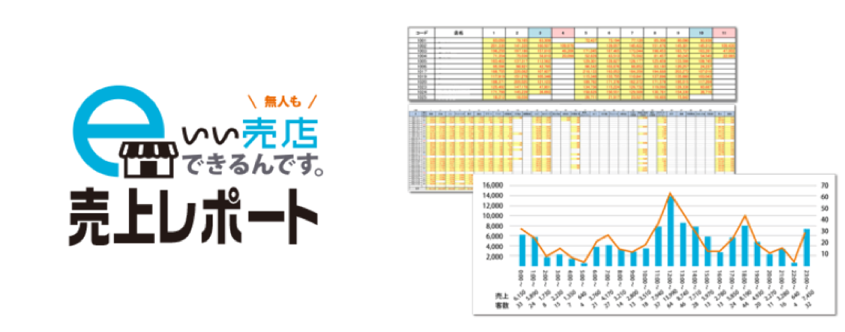 レジ(別途購入費・保守費必要)を導入し、このサービスをご利用いただければ、レジへの商品登録と売上分析表を日報で提供いたします。なお、セルフレジ(別途購入費・保守費必要)を導入することで、24時間365日無人での売店運営が可能になり、人件費の削減、売上UPが期待できます。