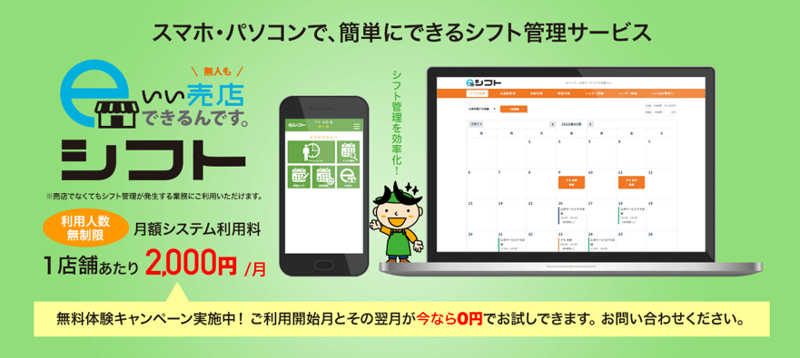 PCやスマホで店舗スタッフの勤怠管理とシフト管理ができ、リアルタイムでその実績が「見える化」されます。不要な残業削減が期待でき、月別の勤務表、出勤表の作成が可能です。オプション(別途費用)で残業や有給の申請・承認機能・入退社書類等のダウンロード機能も付けられます。