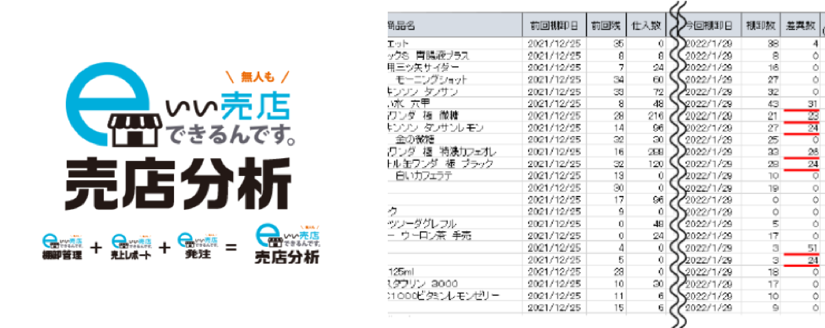 「棚卸管理」、「売上レポート」、「発注」の3つの機能を導入していただくと、棚卸時に前回のデータと比較して、商品ごとの棚卸数の差異や仕入れ数、売上数等の詳細が確認できるようになります。棚卸を「見える化」することで不正の防止にもつながります。
