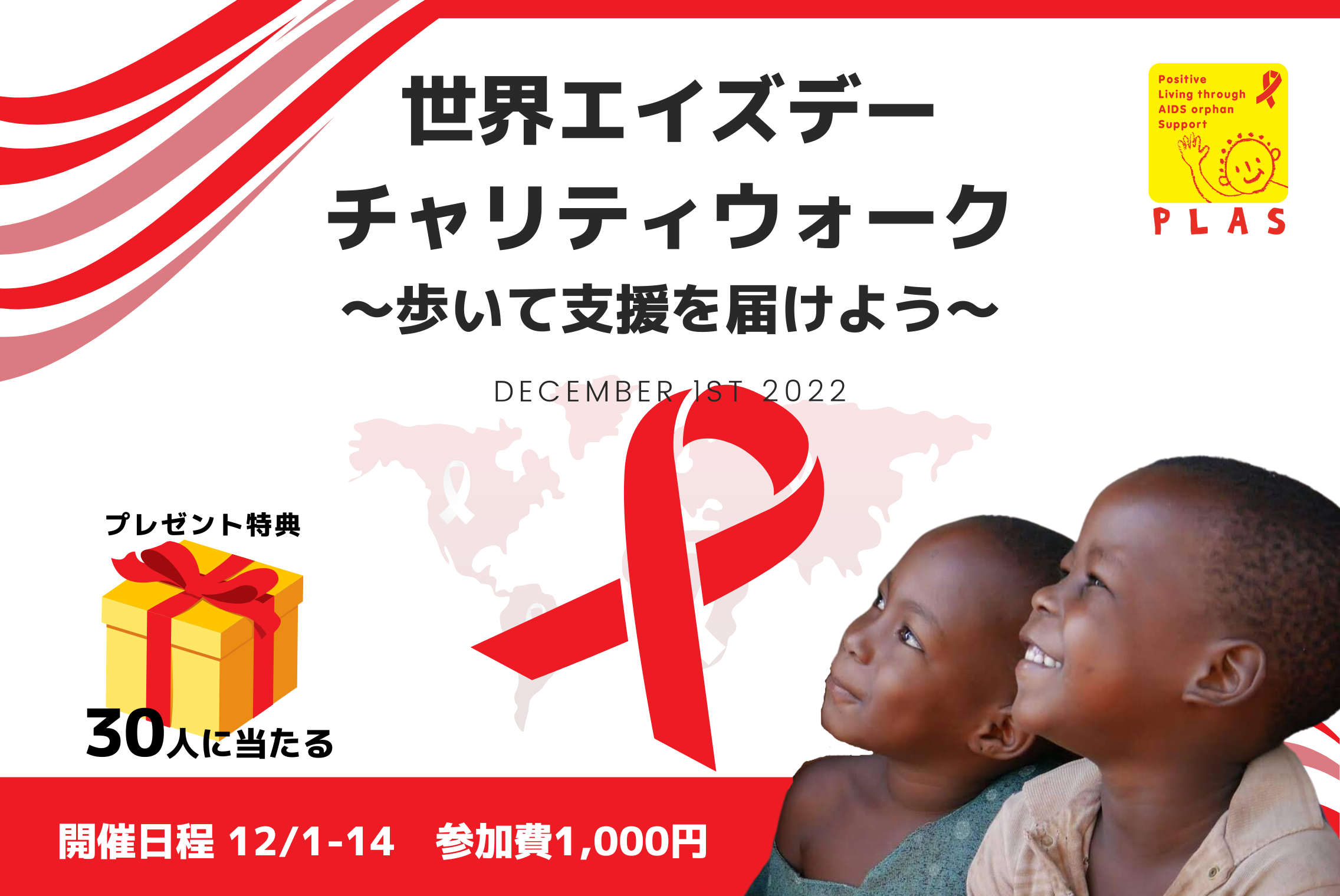 特定非営利活動法人エイズ孤児支援NGO・PLAS(本社:東京都渋谷区、代表理事:門田瑠衣子、以下PLAS)は、アフリカのHIV/エイズ、エイズ孤児について日本の皆さまに伝え、HIV/エイズという病気だけでなく、HIV/エイズが原因で様々な形で苦しむ子どもたちや家庭へ支援を届けるため、世界エイズデーチャリティウォークを開催します。日々の「歩く」時間が社会貢献となり、私たちの活動を支えます。