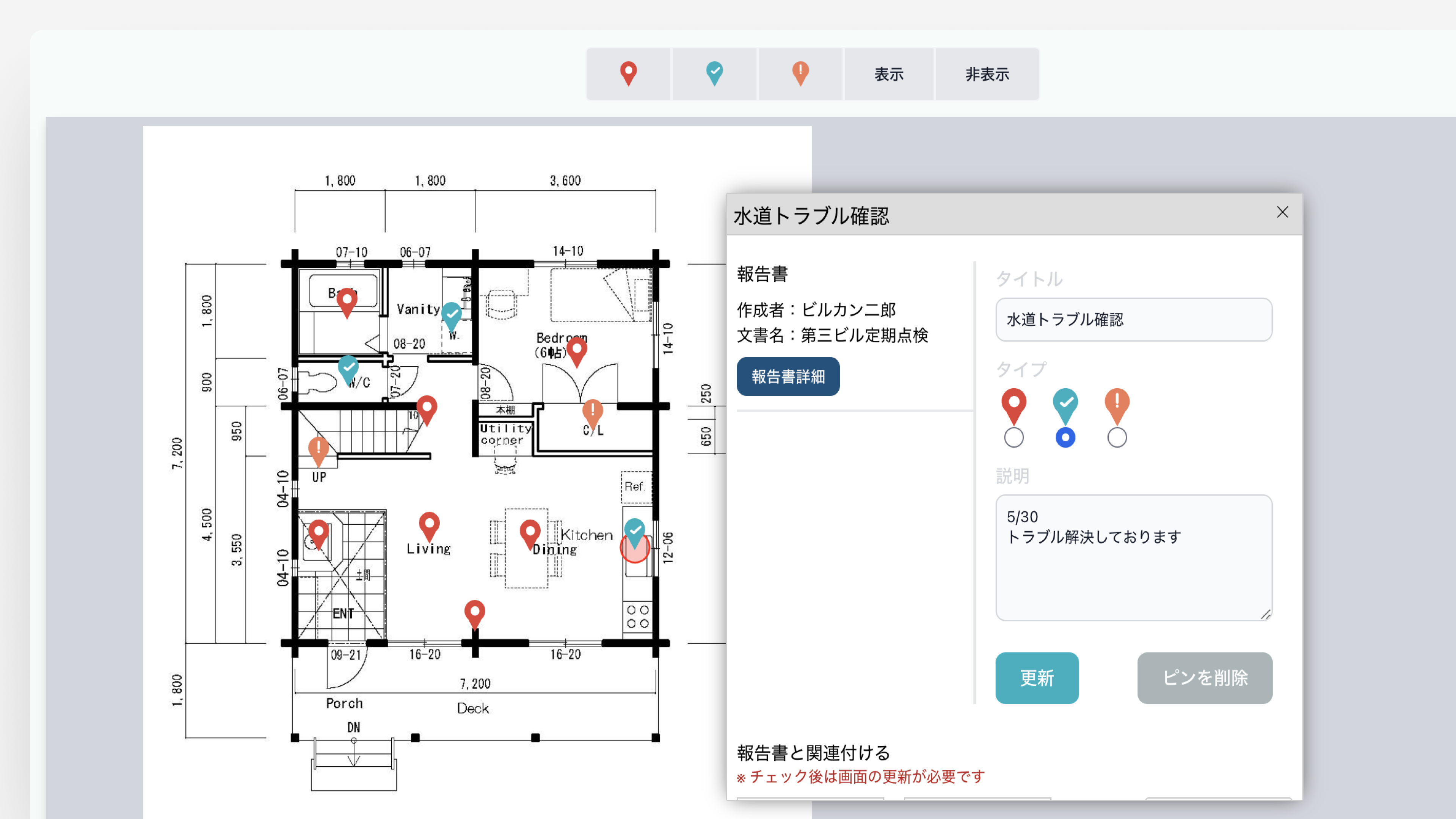 図面上に置いたピンは報告書や設備情報と紐づけることができます。これにより、設備の不具合や修繕の位置情報と報告書をセットで確認することができるようになります。