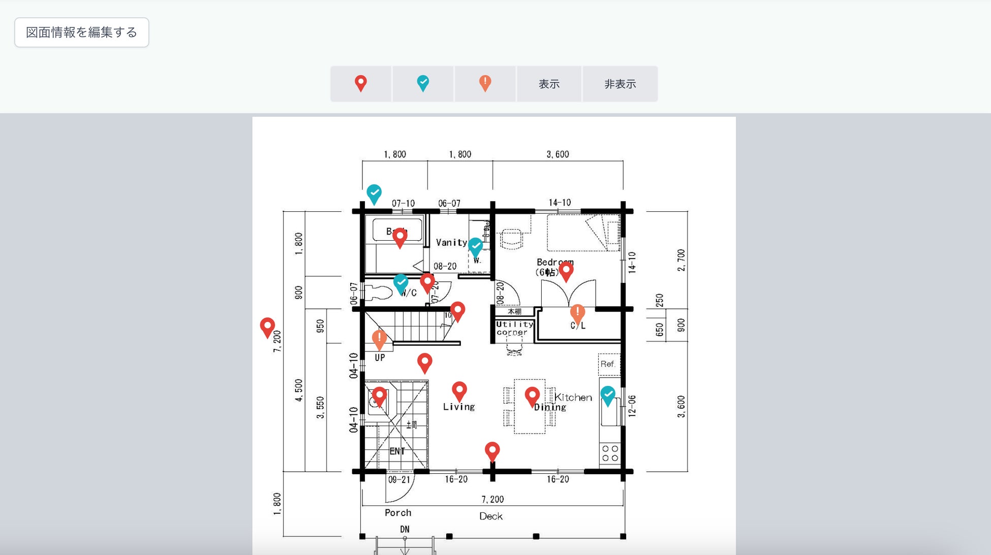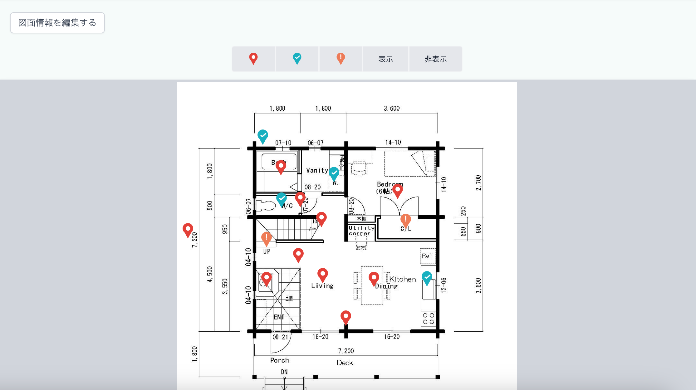 ピン設置による管理: ユーザーは図面上にピンを設置し、設備の位置や問題箇所を可視化できます。これにより、現場の状況把握が容易になります。
