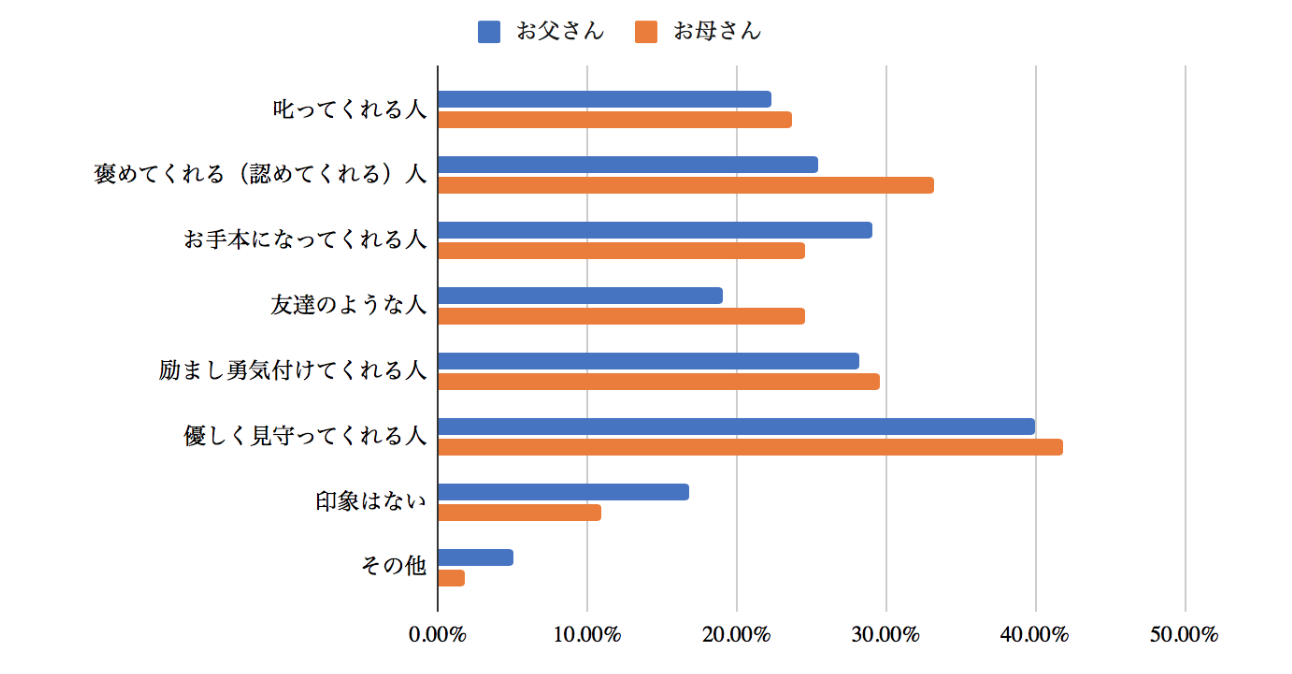「お父さんの存在」と「お母さんの存在」を比較したところ、それほど顕著な差はありませんでしたが、「お母さんの存在」の方が、「褒めてくれる(認めてくれる)人」「友達のような人」の回答が多い結果となりました。逆に「お父さんの存在」に多かったのは、「お手本になってくれる人」「印象はない」という結果でした。
