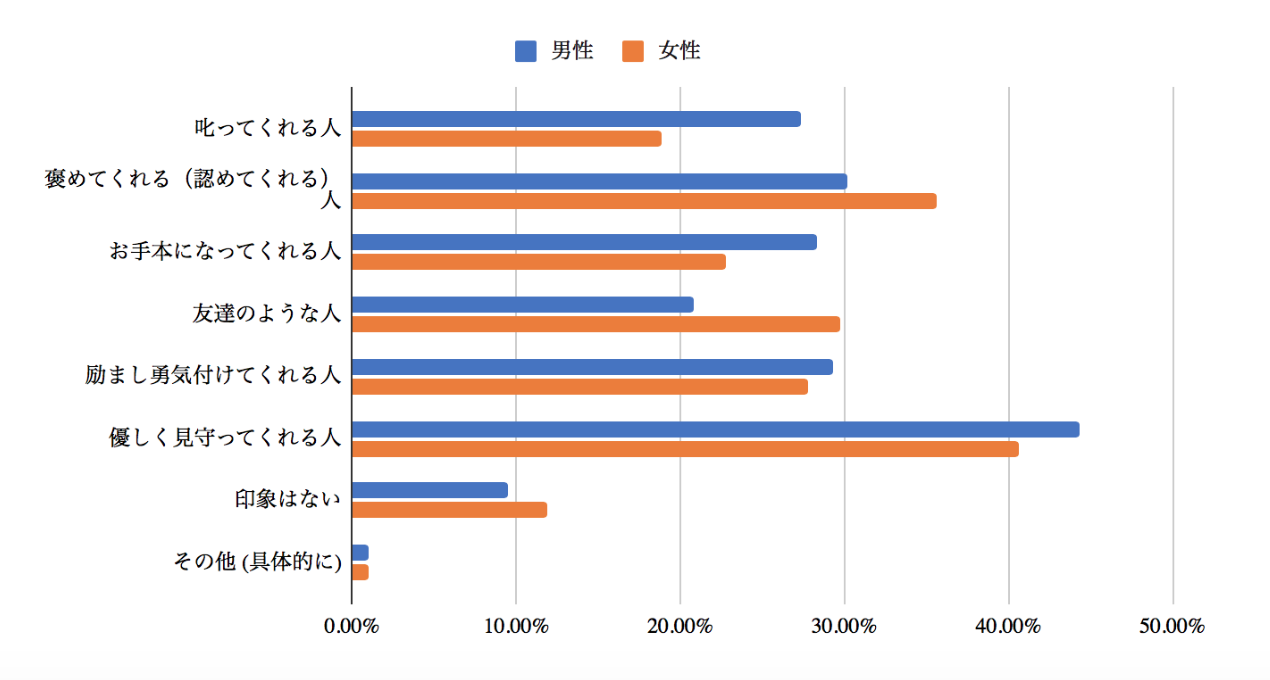 男子が一番多く回答したのは、「優しく見守ってくれる人」39人(36.8%)でした。2番目に多く男子が回答したのは、「お手本になってくれる人」30人(28.3%)「褒めてくれる(認めてくれる)人」28人(26.4%)でした。