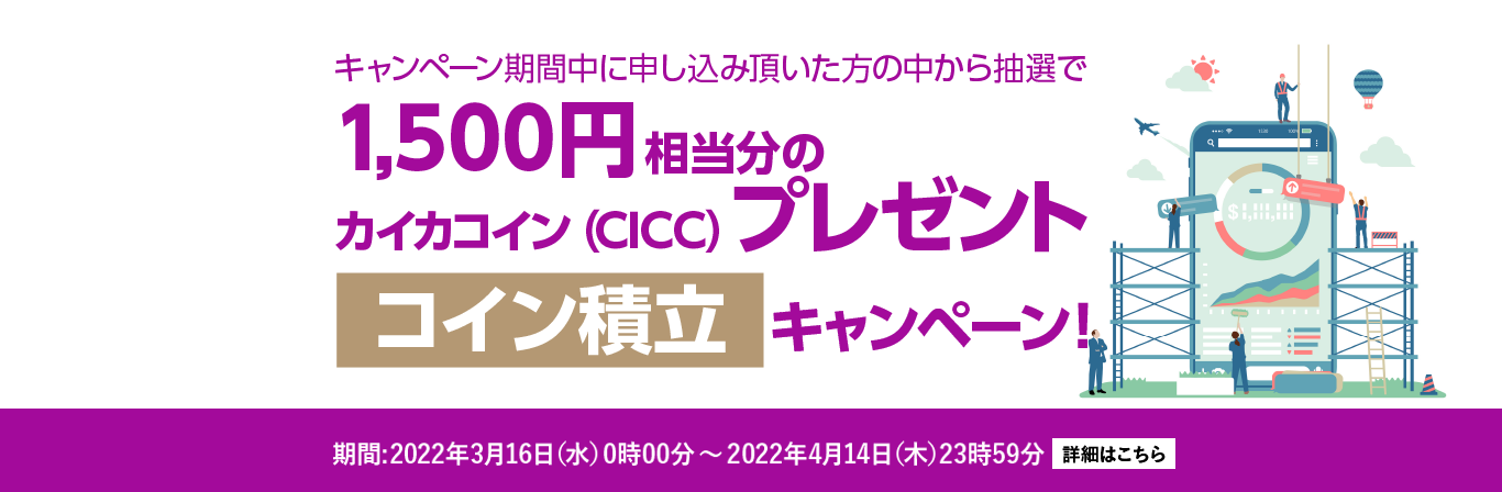 サービスリニューアルを記念して、「Zaifコイン積立リニューアル記念!1万円以上お申込み頂いた方の中から、抽選で50名様にカイカコイン(CICC)プレゼントキャンペーン」を開催いたします。