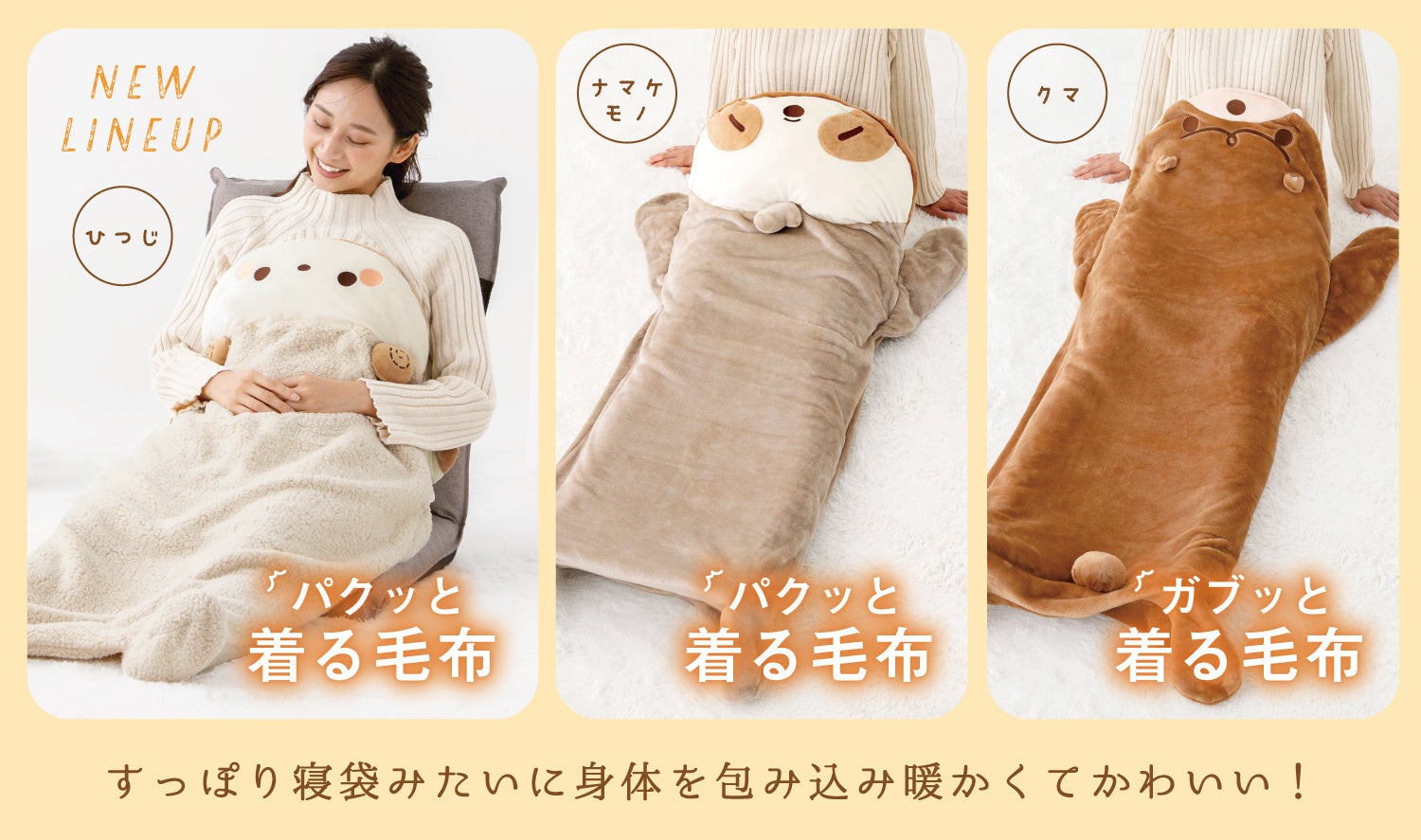 「ガブッと着る毛布/パクッと着る毛布」・・・“着る毛布”同様、フランネル素材を使用し、しっとりなめらかな肌触りです。足先まですっぽり着用することができる為、暖かいことはもちろんのこと、まるで大きなイヌに“ガブッと”食べられているような見た目でお部屋でのくつろぎタイムをより楽しく、快適に過ごすことができます。2023年秋冬では、既存のシバイヌ柄に加えて新柄(クマ、ヒツジ、ナマケモノ)を3種類加えた4柄で展開をします。