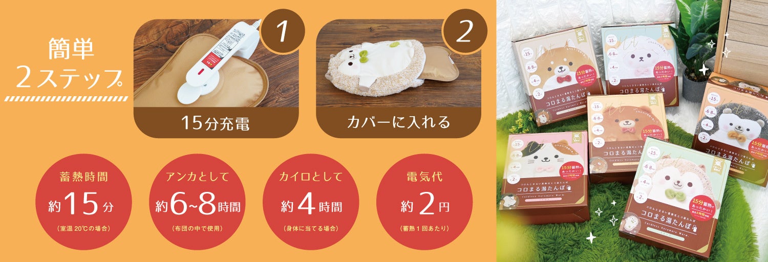 弊社の人気商品である「コロまるシリーズ」からお湯は一切いらない、コードレスで持ち運びにも便利な“蓄熱式湯たんぽ”の登場です。1回の蓄熱時間が約15分で、最長約8時間暖かさが持続する蓄熱式の湯たんぽです。(※用途によって持続時間は変動します。) 蓄熱1回あたり約2円で節電対策にもなり、家計にも優しく防寒対策ができます。
