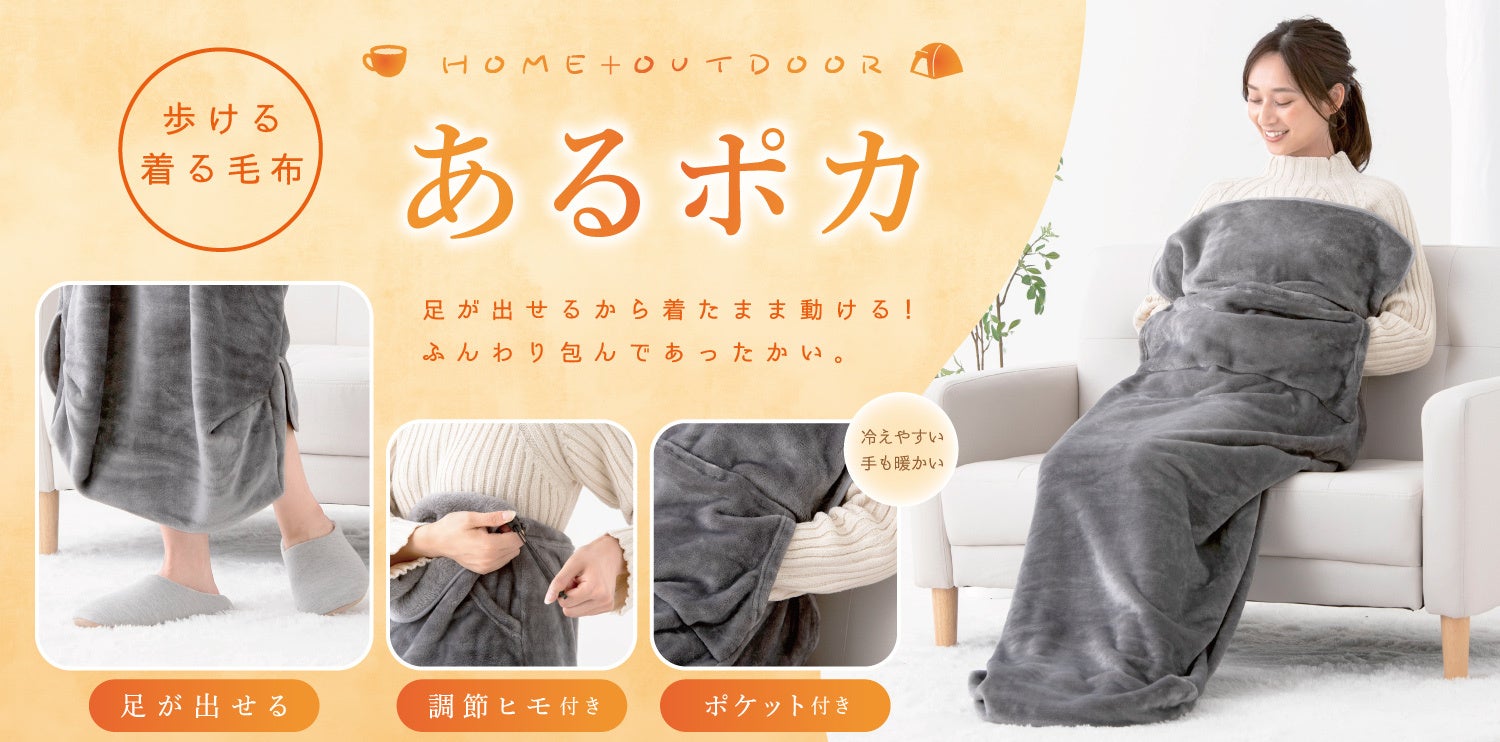 「着る毛布 あるポカ」・・・着用したまま歩くことができる「着る毛布」です。足先にポケットが付いているので、くつろぐ時には足先まで温まります。またウエスト部分には調節ゴム付き、冷えやすい手を入れられるポケット付きです。素材は“着る毛布”同様、フランネル素材を使用しており、しっとりなめらかな肌触りです。お部屋でくつろぐ時や、キャンプなどのアウトドアシーンでもお使い頂けます。