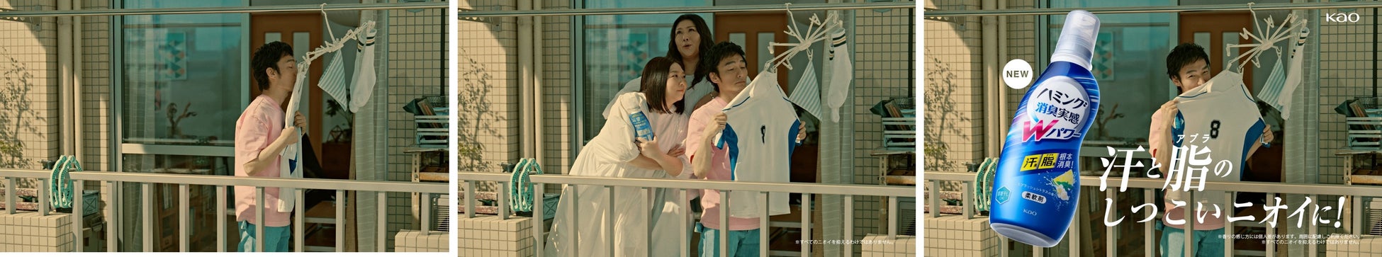 メインキャラクターの草彅さんと、その時々で変わるゲストが“ハミングの精”として登場するTVCMシリーズ。第二弾となる本CMでは、ベランダで洗濯物のニオイ残りを気にする草彅さんに、背後から白いワンピースに身を包んだ海原やすよ ともこさんが「そのしつこい汗と脂のニオイにはな、ハミング~消臭~実感♪Wパワー♪」と猛プッシュする様子が描かれています。2人の勢いにつられ、「ニオうわな~ほんまニオうわな~」と関西弁になってしまう草彅さん、「ほんまちゃうねん」と大阪弁でツッコミを入れるやすともさんと、テンポの良い漫才のような掛けあいが楽しめる内容となっています。