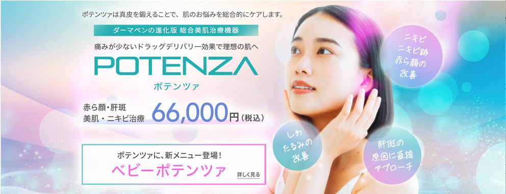 「ポテンツァ」はニキビや毛穴の開き、肝斑、赤ら顔と言ったあらゆる肌悩みに効果的な施術です。新たに銀座高須クリニックに導入された「ベビーポテンツァ」は通常のポテンツァから出力・パルス幅・深さを最適化し、老化細胞を除去してベビーコラーゲンを増やす薬剤を注入することで、より柔らかい赤ちゃんのような弾力のある肌に導きます。