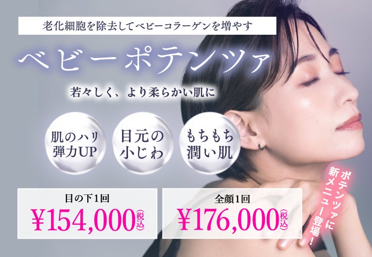 ベビーポテンツァとは、目の下などにできてしまった細かい小ジワとサヨナラできる総合的なアンチエイジングメニューです。老化細胞を除去してベビーコラーゲンを増やす薬剤を注入することで、プニプニな赤ちゃん肌に。加齢によるコラーゲンの減少だって怖くないですよ!