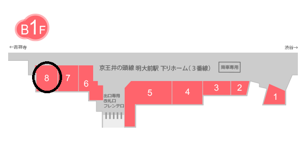 場所:京王線・井の頭線 明大前駅 3番線ホーム(井の頭線 吉祥寺方面行き‐商業施設「フレンテ明大前」地下1階店舗)