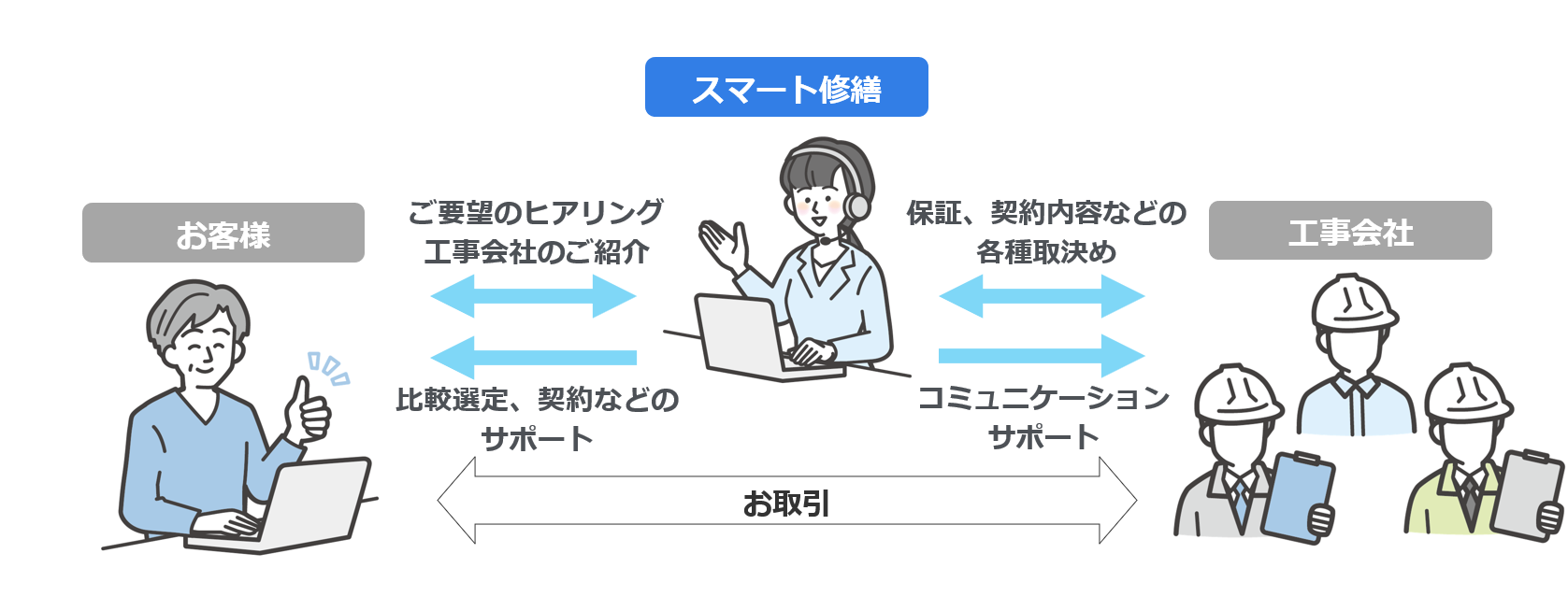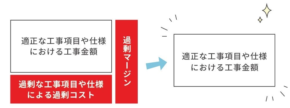 お客様自身が複数の工事会社から見積や工事内容の提案をうけることで、競争原理を活用した低コスト化やご要望に応じた工事が実現できます。