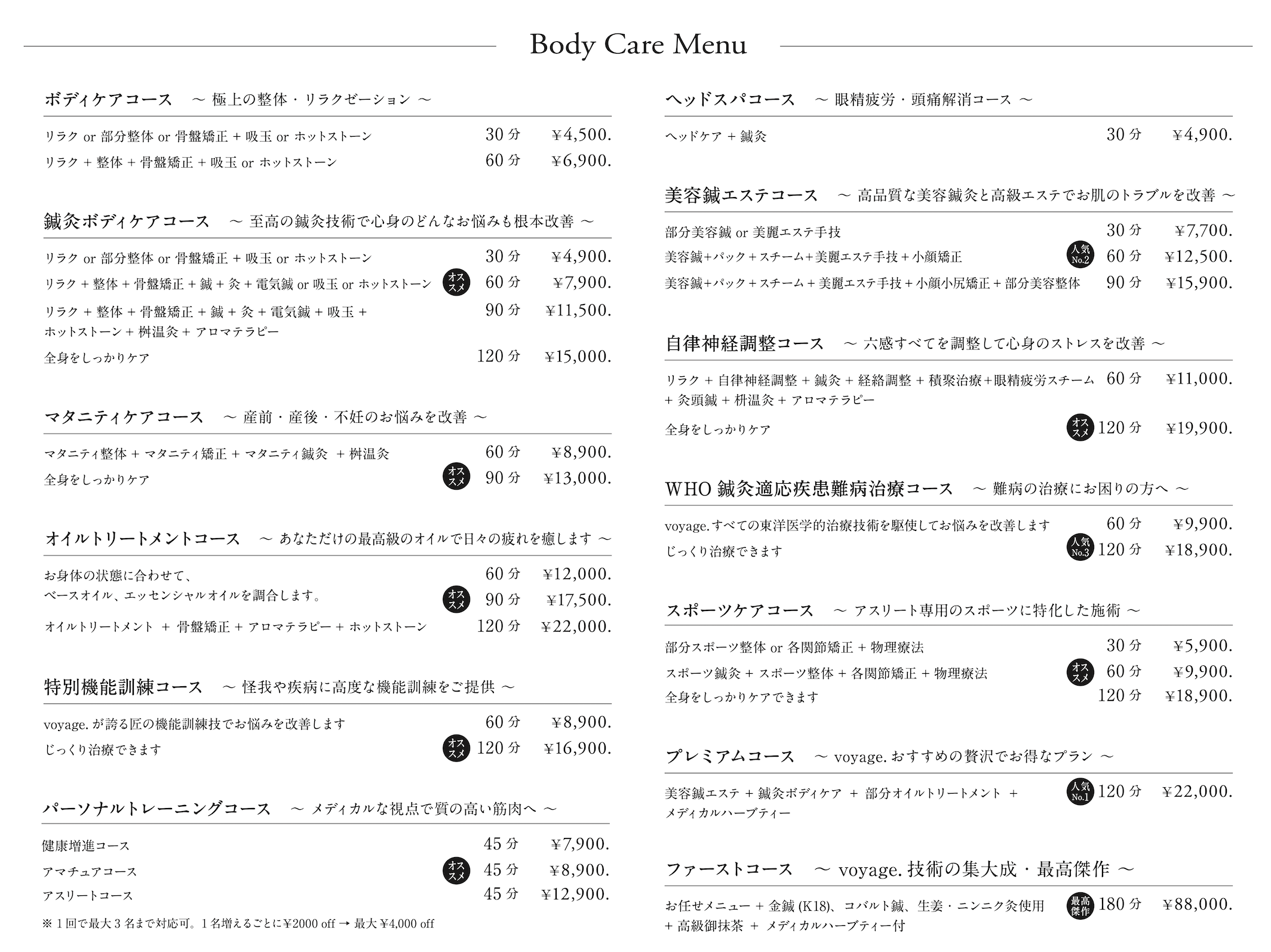 様々な国家資格を持つ経験豊富な一流のセラピストが、お客様のココロとカラダのお悩みに合わせて、豊富な種類の施術からあなただけのオーダーメイドな施術をご提供します。またvoyage.に来院されるお客様は、東京近郊や首都圏のみならず、北は北海道、長野、新潟、静岡、山梨、徳島、そして南は沖縄...日本全国よりお越しいただいております。ボディケア、美容鍼灸エステ、トレーニング、マタニティケア、自律神経調整、骨盤矯正など、幅広い目的のお客様のお悩みを解決いたします。