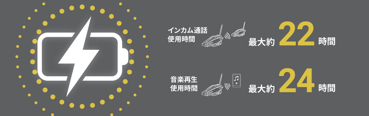 ※インカム通話使用時間:最大約22時間 音楽再生使用時間:最大約24時間