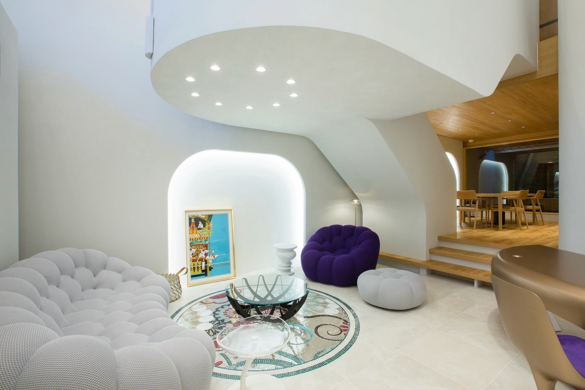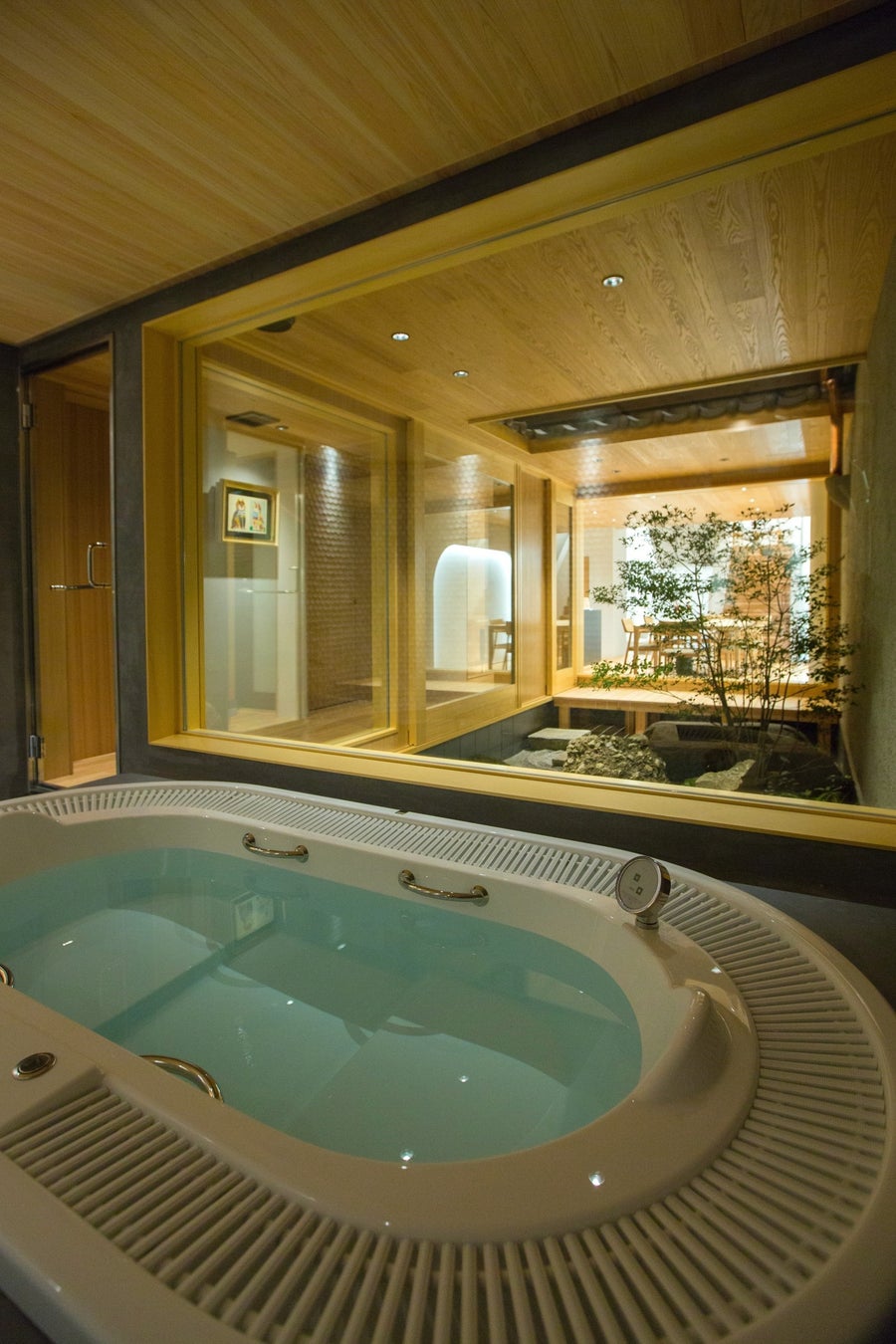 伝統的な町家の外観と対照的に、内部は超モダンな空間。