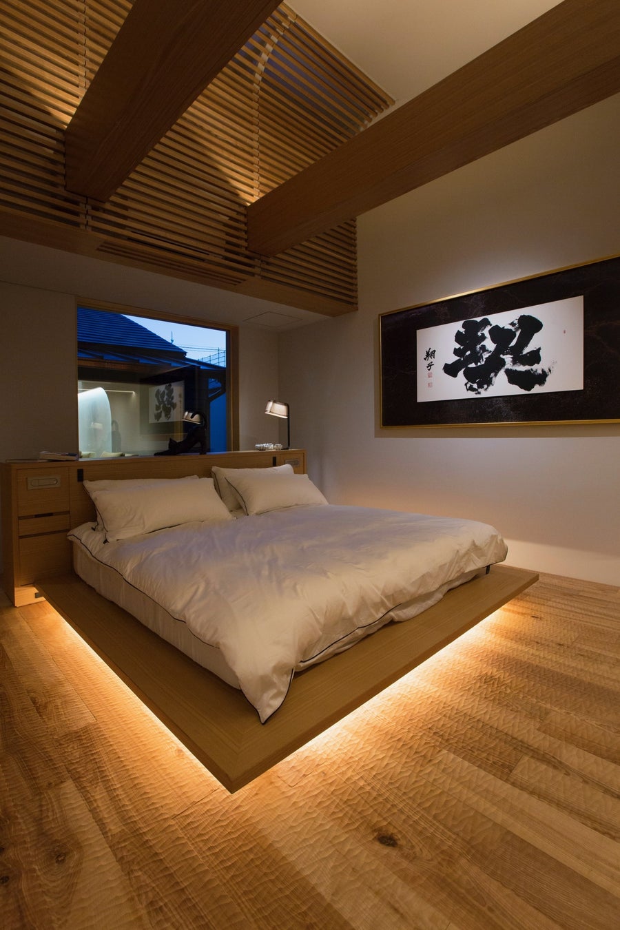 2階寝室。伝統技術の「なぐり」工法で仕上げた床。飾られた書は、金澤翔子氏による揮毫。