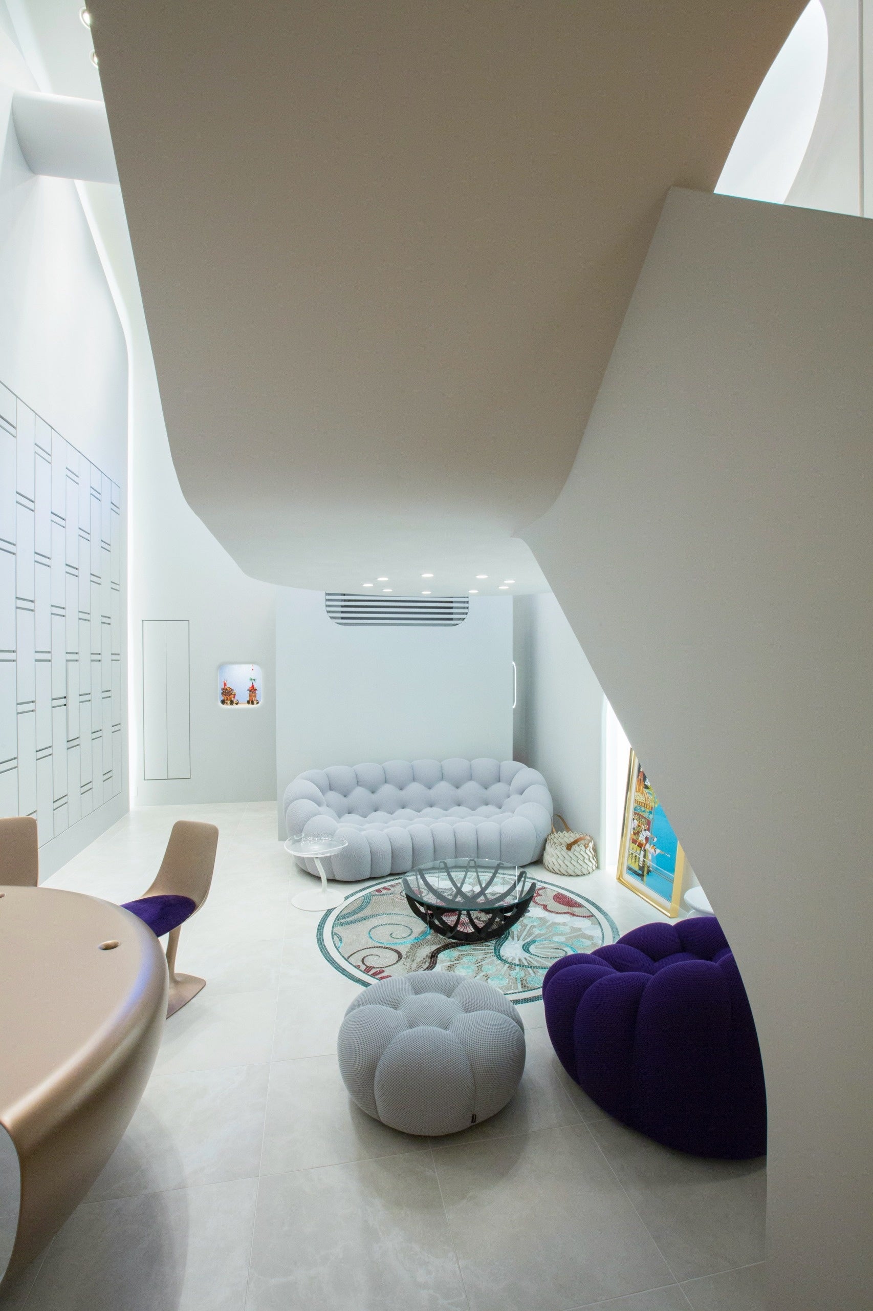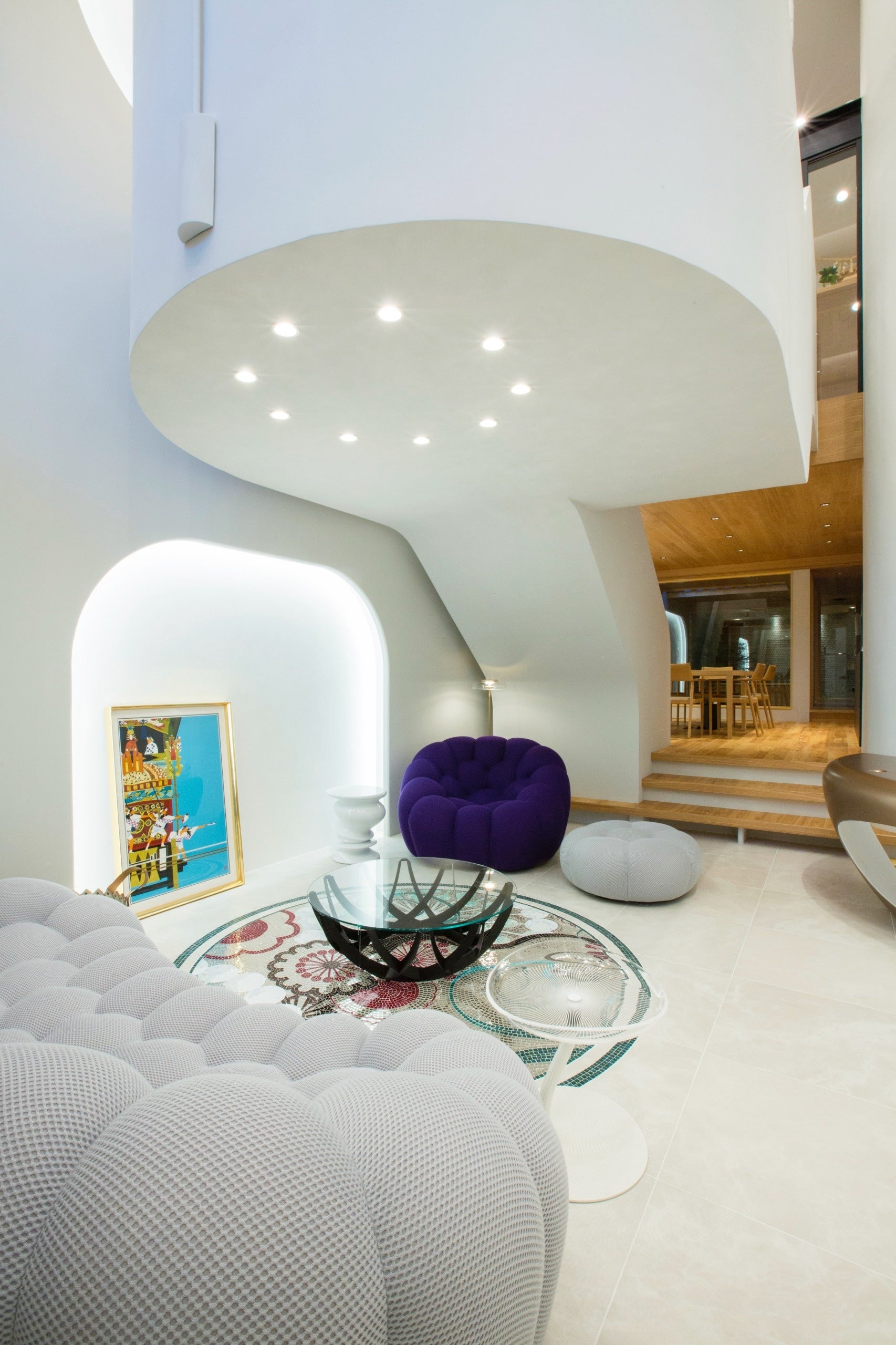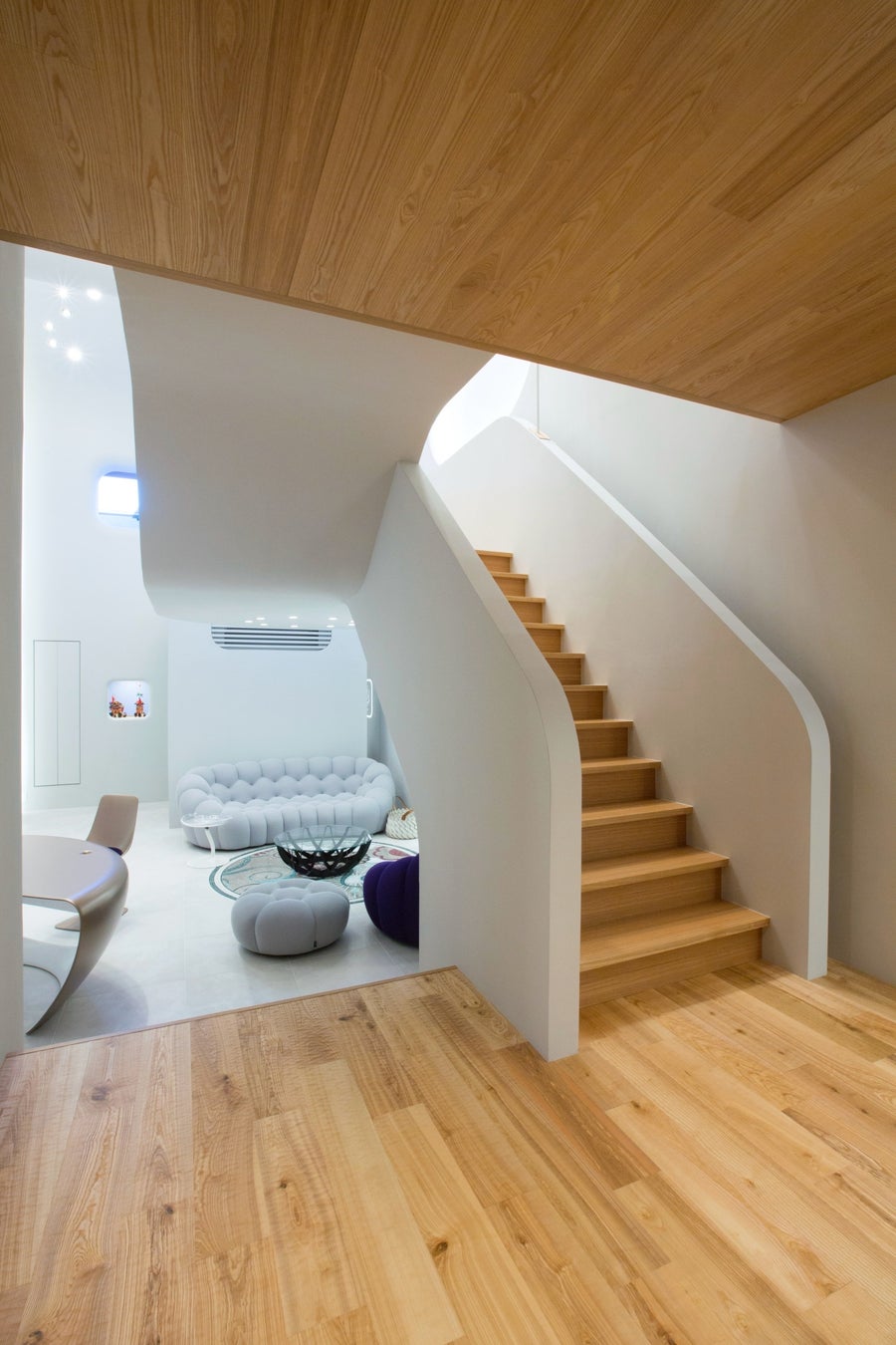 吹き抜けのダイナミックな空間に有機的な曲線を描く階段