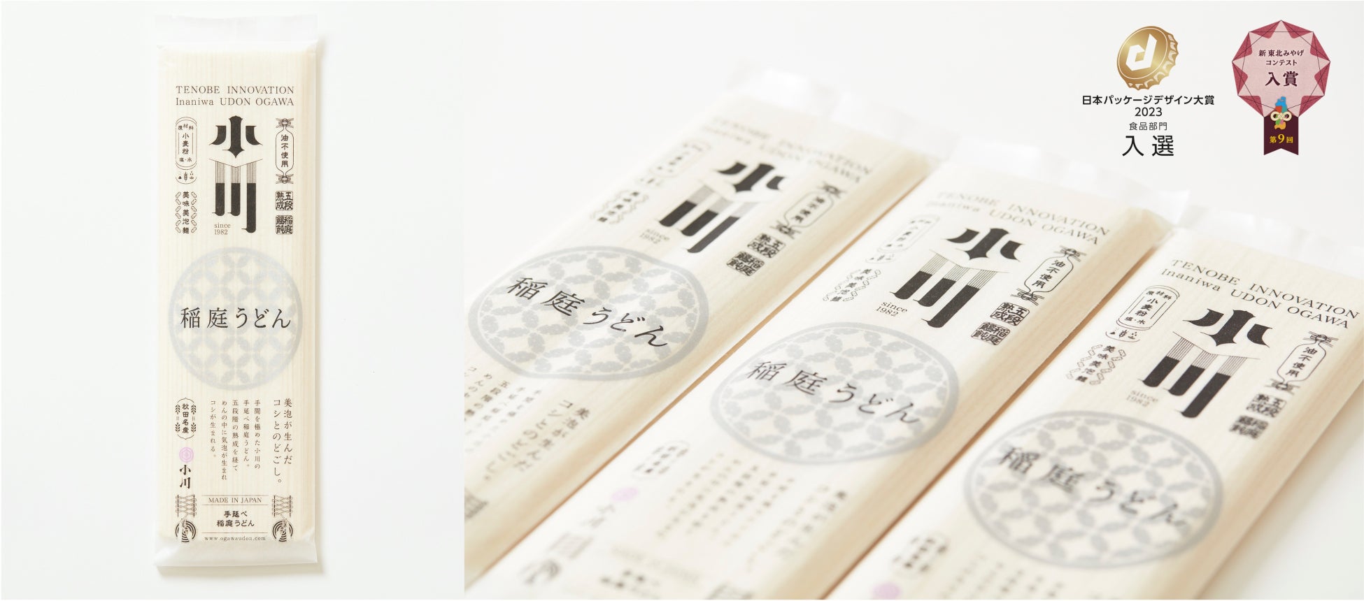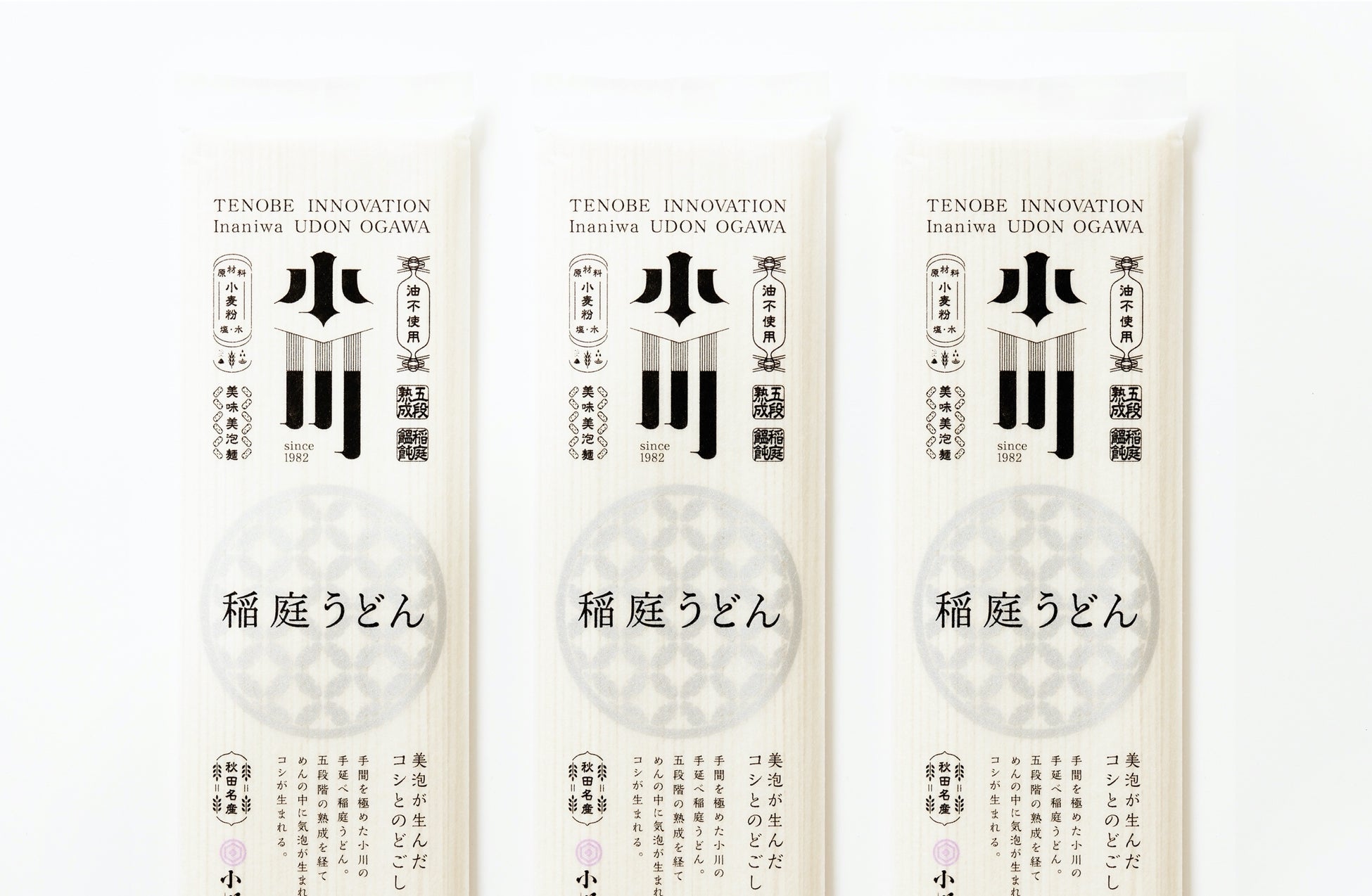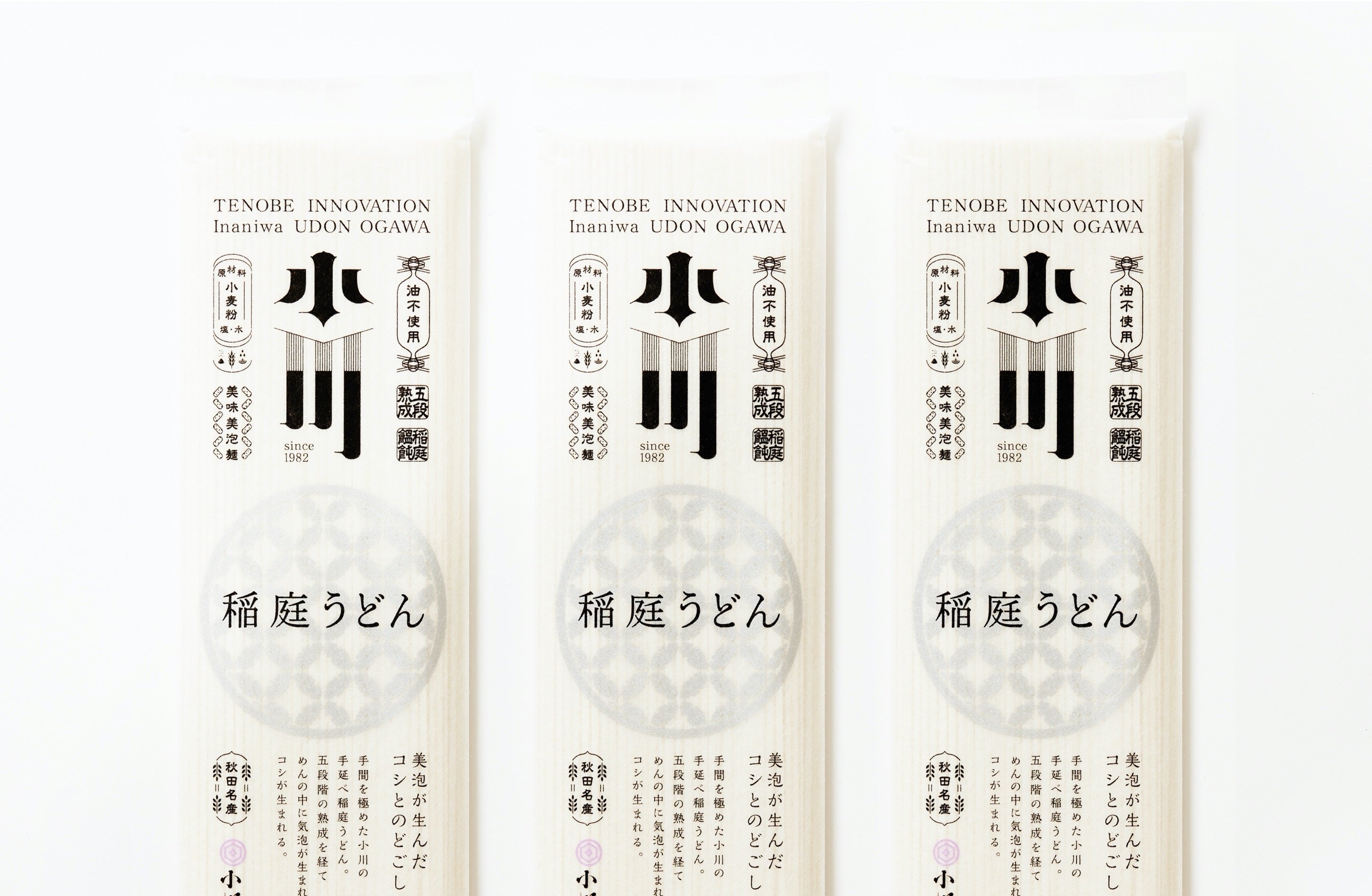 「稲庭うどん小川」のこだわりを一つひとつ「判子」としてパッケージに刻印することで魅力を表現しています。