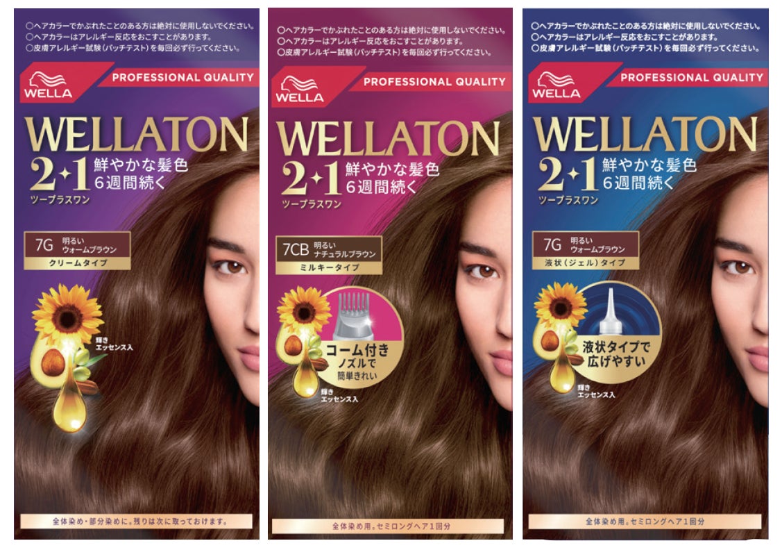 今回、ウエラトーン 2+1の特長である「輝きエッセンス*2」(99%植物由来のトリートメント成分)にオリーブオイルを追加配合。また、白髪もしっかり染めながら、おしゃれで自分らしい髪色を楽しみたいという消費者ニーズにお応えするため、パッケージも大幅リニューアルいたしました。