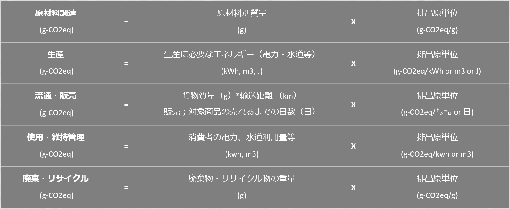 -温室効果ガス排出量の算出は、「原材料調達」「生産」「物流・販売」「使用・維持管理」「廃棄・リサイクル」の5段階で行います。いわば「ゆりかごから墓場まで」のスパンで、商品ライフサイクルのアセスメントを通じた算出が可能です。計算は、「原材料の質量」「生産時に用いた電気・水道の量」「輸送や利用者における電気・水道利用量」「廃棄・リサイクルの質量」といったデータを入力することで、実施できます。