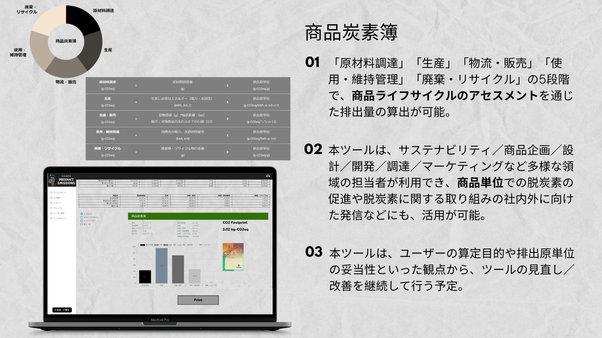 -開発に際しては、国内の排出原単位や海外データベースを引用/加工したものを、基礎として活用しています。特に温室効果ガス排出量の算出には、環境省が公表した排出原単位データベースおよび海外の排出原単位データベースを使用しました。基準が明確であるため本ツールは、サステナビリティ/商品企画/設計/開発/調達/マーケティングなど多様な領域の担当者が利用できます。商品単位での脱炭素の促進や、脱炭素に関する取り組みの社内外に向けた発信などにも、活用が可能です。(本ツールはライフサイクルアセスメントの手順のうち、目的及び調査範囲の設定と、インベントリ分析に適用します。)