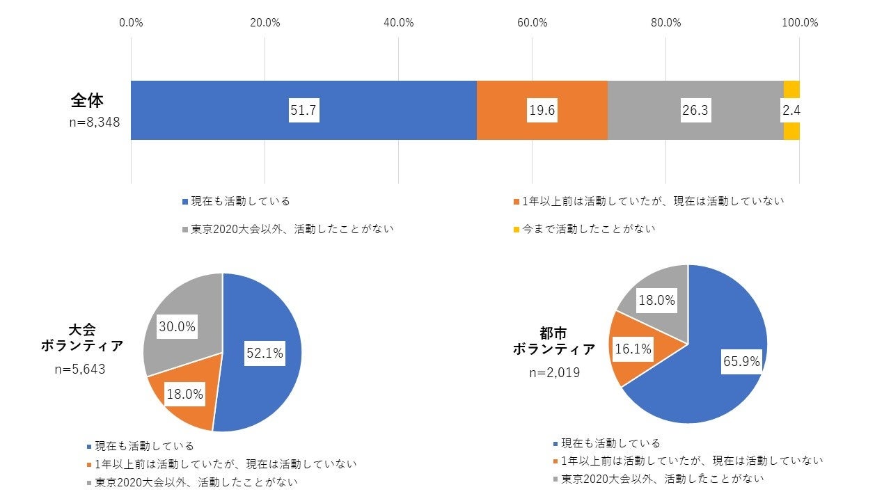 大会後のボランティア参加については、「現在も活動している」が約半数を占めた。東京2020大会以外活動していない方は26.3%であった。都市ボランティア経験者においてボランティア参加が盛んな状況であった。