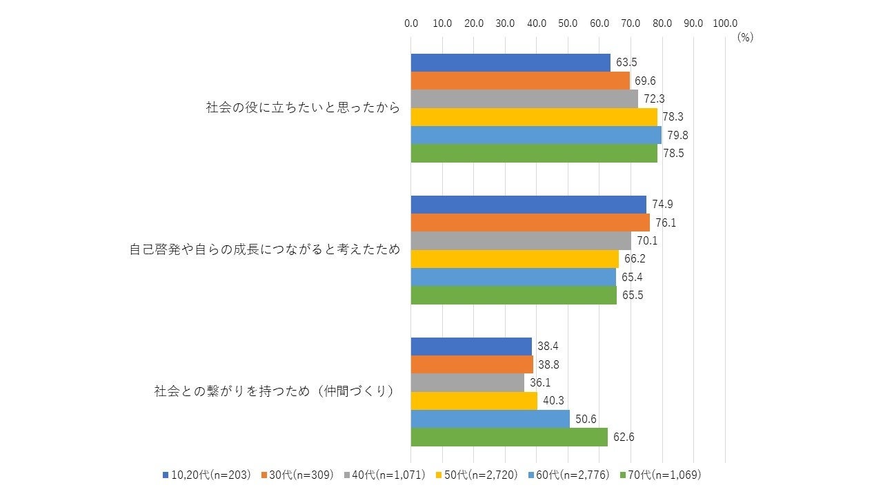 年代別にみると、 「社会の役に立ちたいと思ったから」 「社会との繋がりを持つため」は年代が高い方の回答が多く、 「自己啓発や自らの成長につながると考えたため」は年代の若い方の回答が多かった。