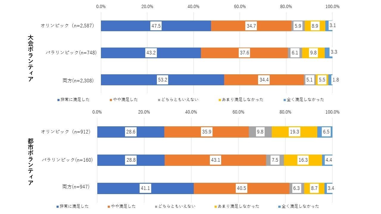 また、東京2020大会にボランティアとして活動したことへの満足度について、大会ボランティアと都市ボランティアを比較すると、大会ボランティアの方が都市ボランティアよりも高い傾向にあった。