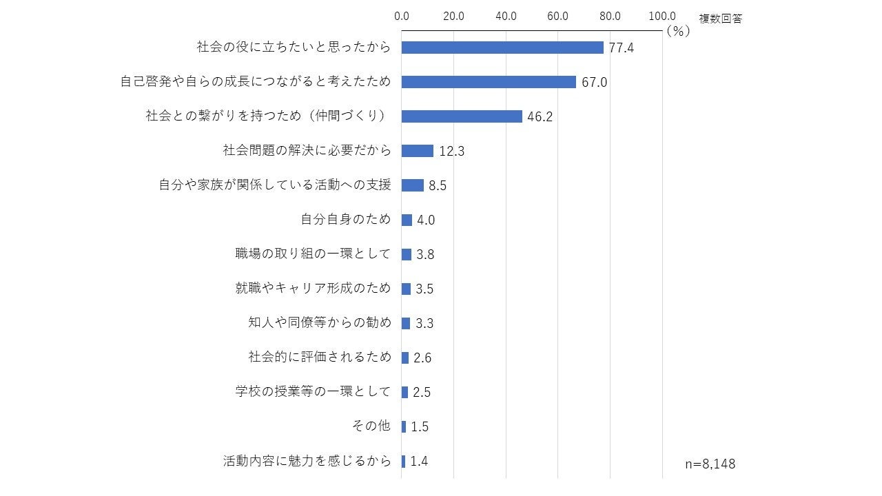 また、ボランティア参加理由については、「社会の役に立ちたいと思ったから」が最も多く、次いで「自己啓発や自らの成長につながると考えたため」「社会との繋がりを持つため」が多かった。