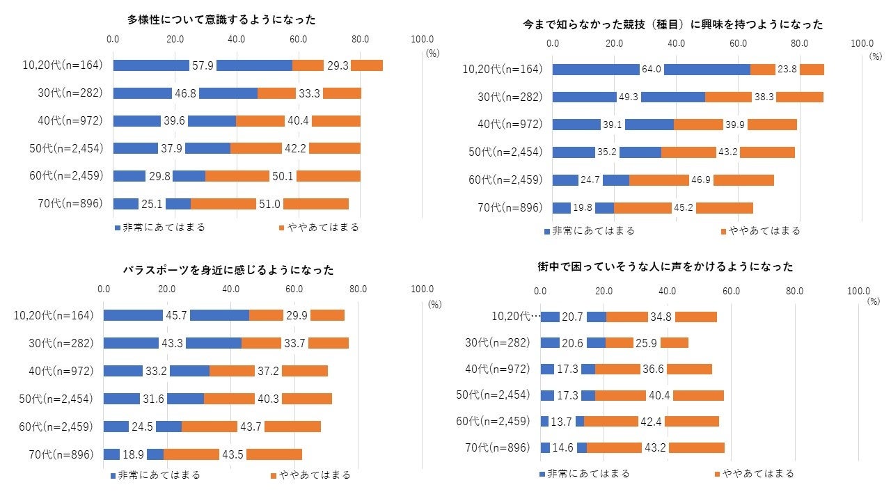 大会後の自身の考え方や行動の変化を年代別にみると、「多様性について意識するようなった」「今まで知らなかった競技(種目)に興味を持つようになった」「パラスポーツを身近に感じるようになった」については、若い世代において「非常にあてはまる」への回答が多かった。「街中で困っていそうな人に声をかけるようになった」については、世代間に大きな差はなかった。