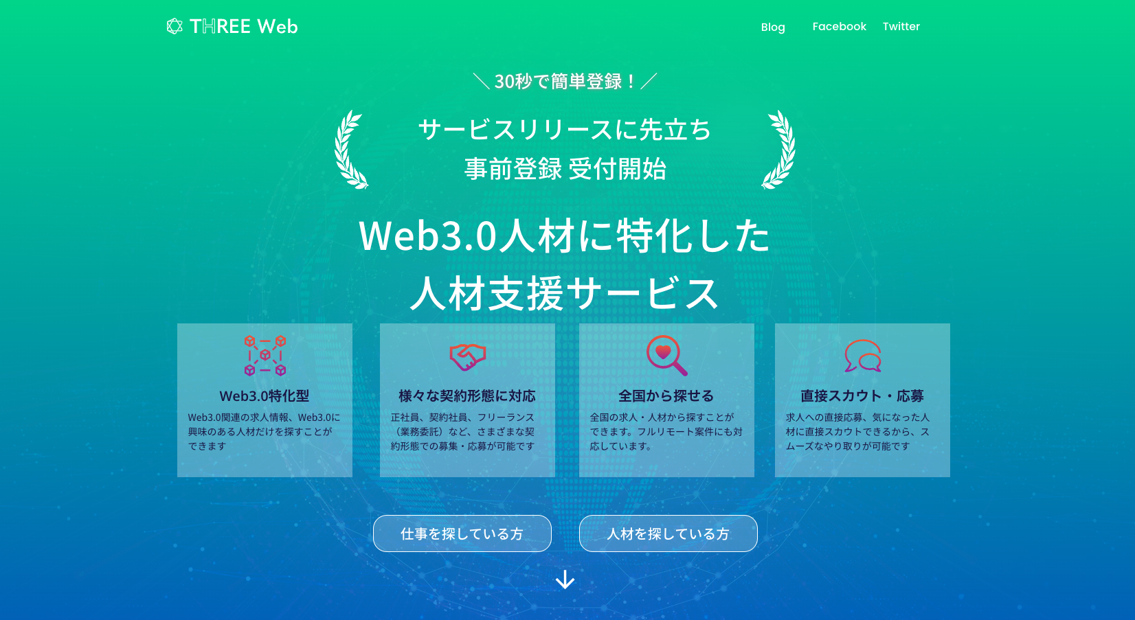- Web3.0特化求人サービス「Three Web」の事前登録開始(事前登録特典あり)