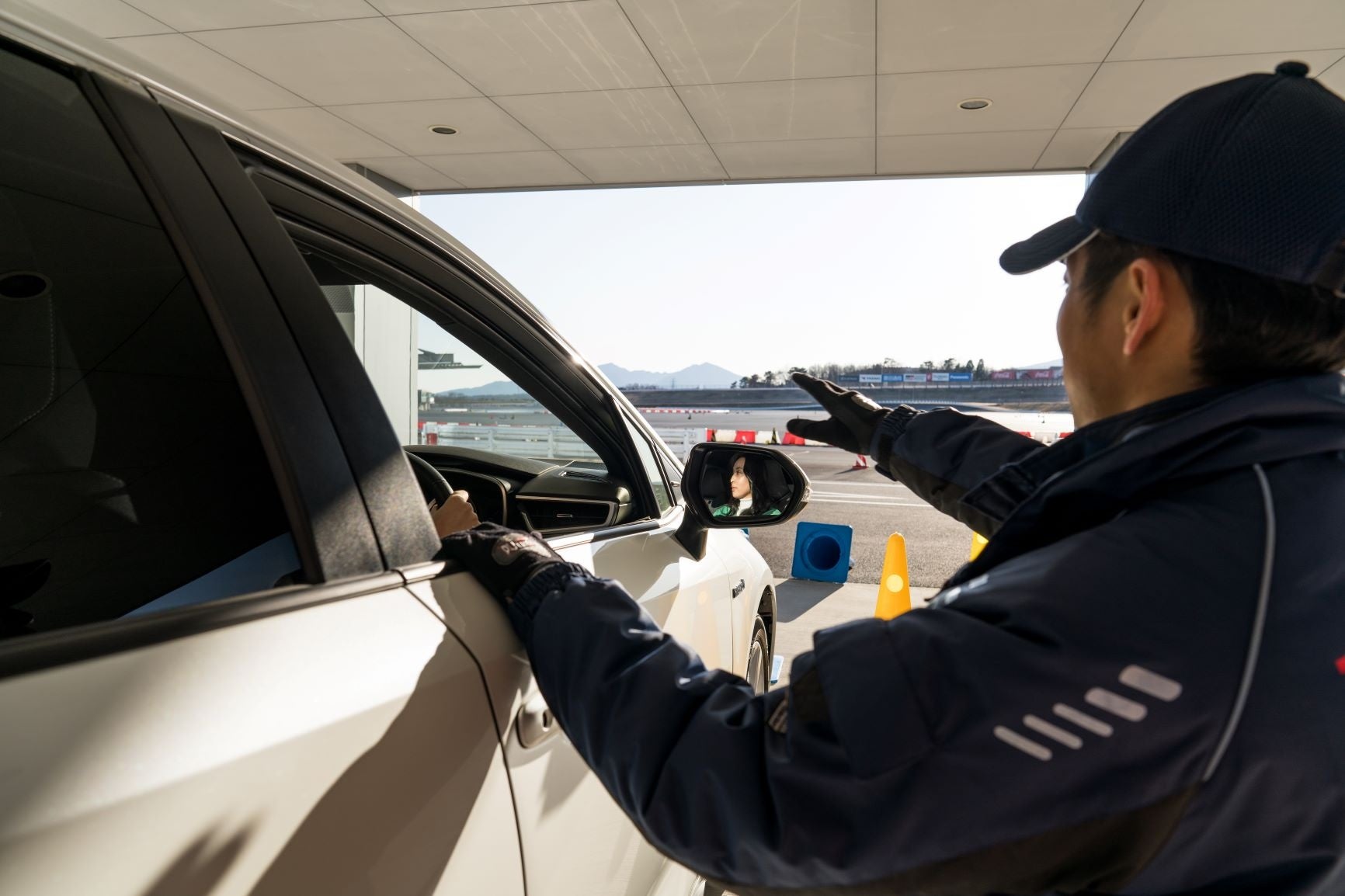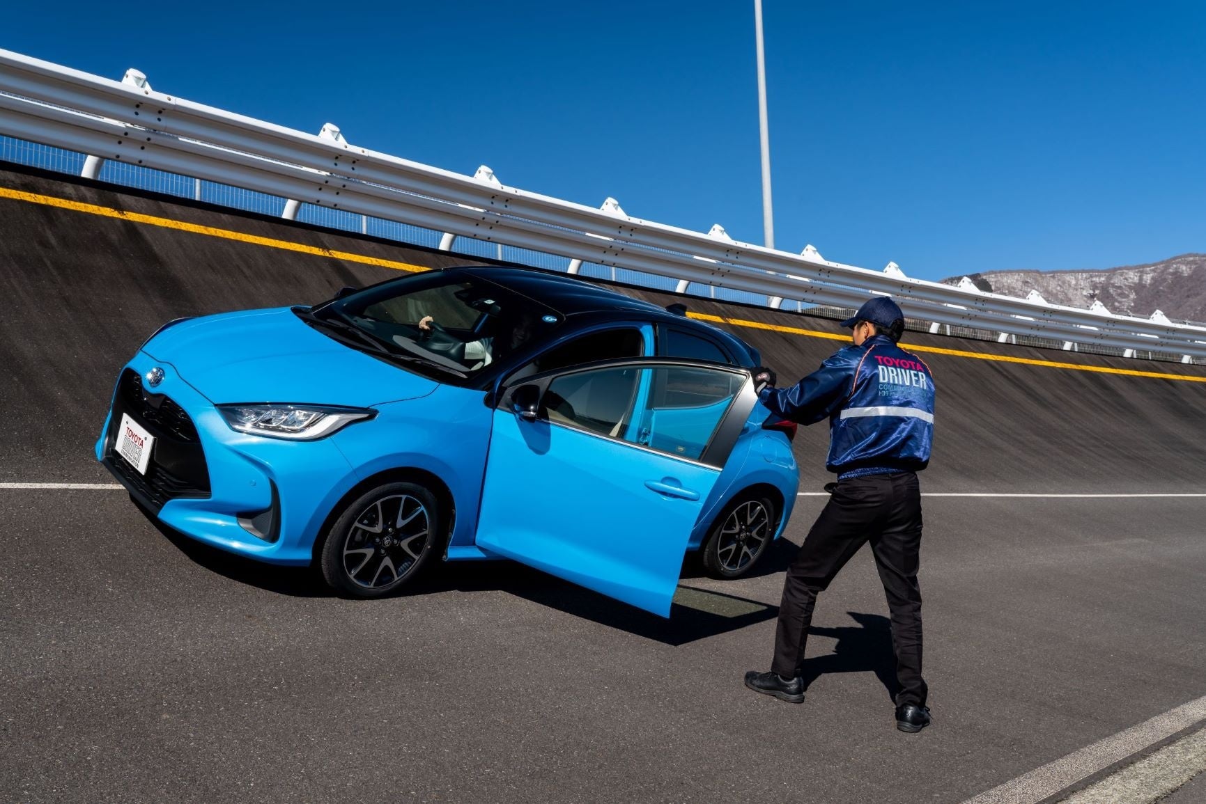 ⑤度バンク:バンクの途中にクルマを停め、カーブで遠心力が働いている状態を再現し、コーナリング中の運転姿勢を確認。また、横転時のドアの重さなどを体験