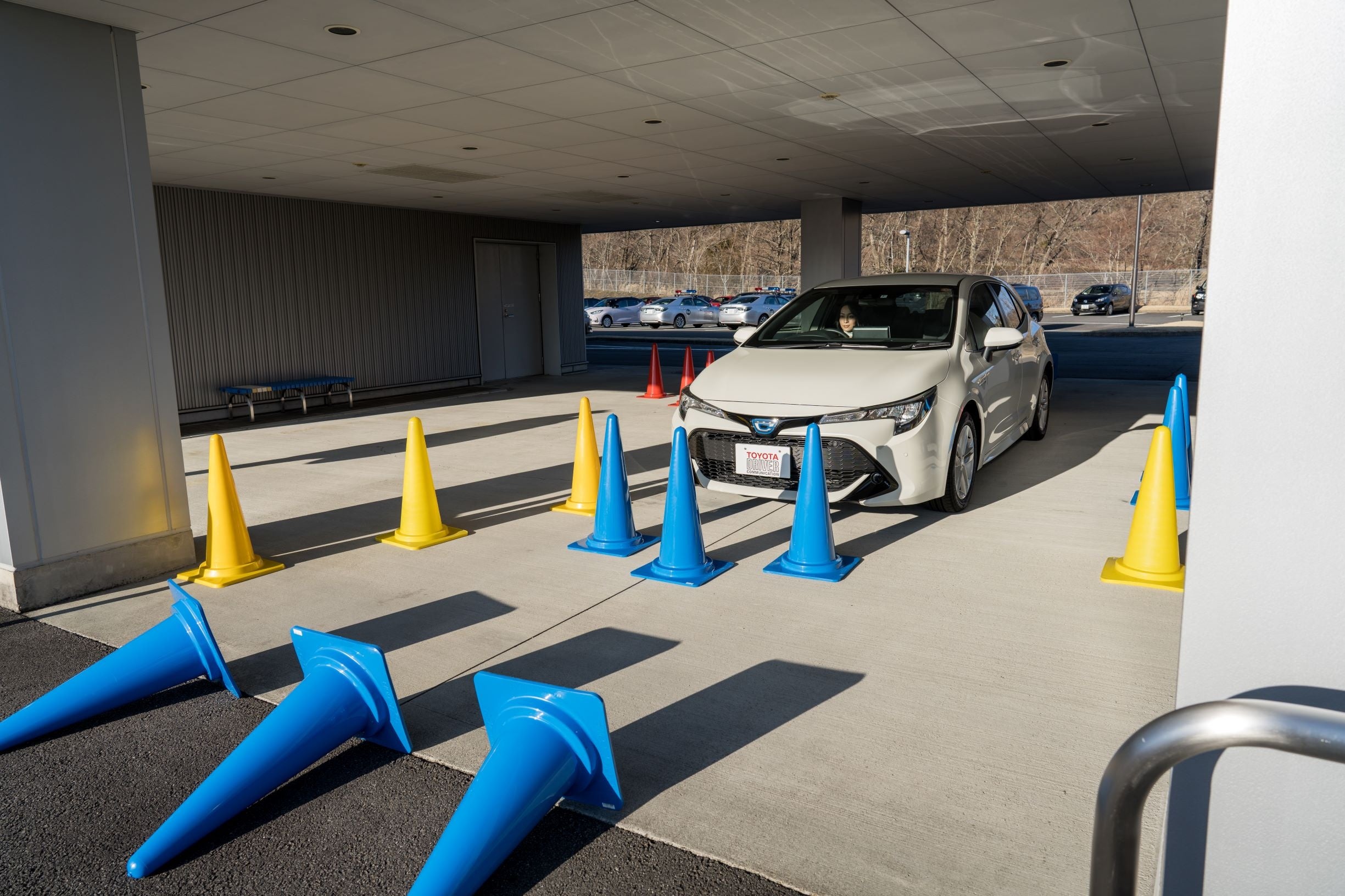 運転席から見て、安全を確認できるのは、どこまでなのか。どこが見えないのか。クルマの周囲にパイロンを並べ、前後左右の死角を確認します。