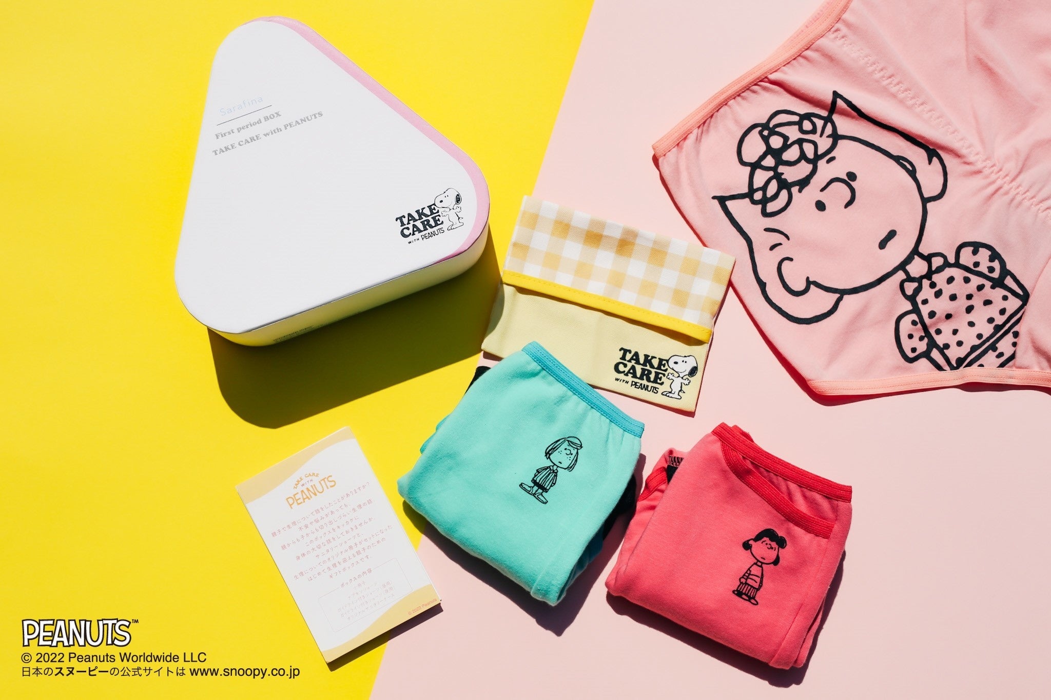 カラフルなショーツにピーナッツの仲間たちがプリントされた可愛らしいセットで、はじめて生理を迎えた時の不安な気持ちに寄り添います。