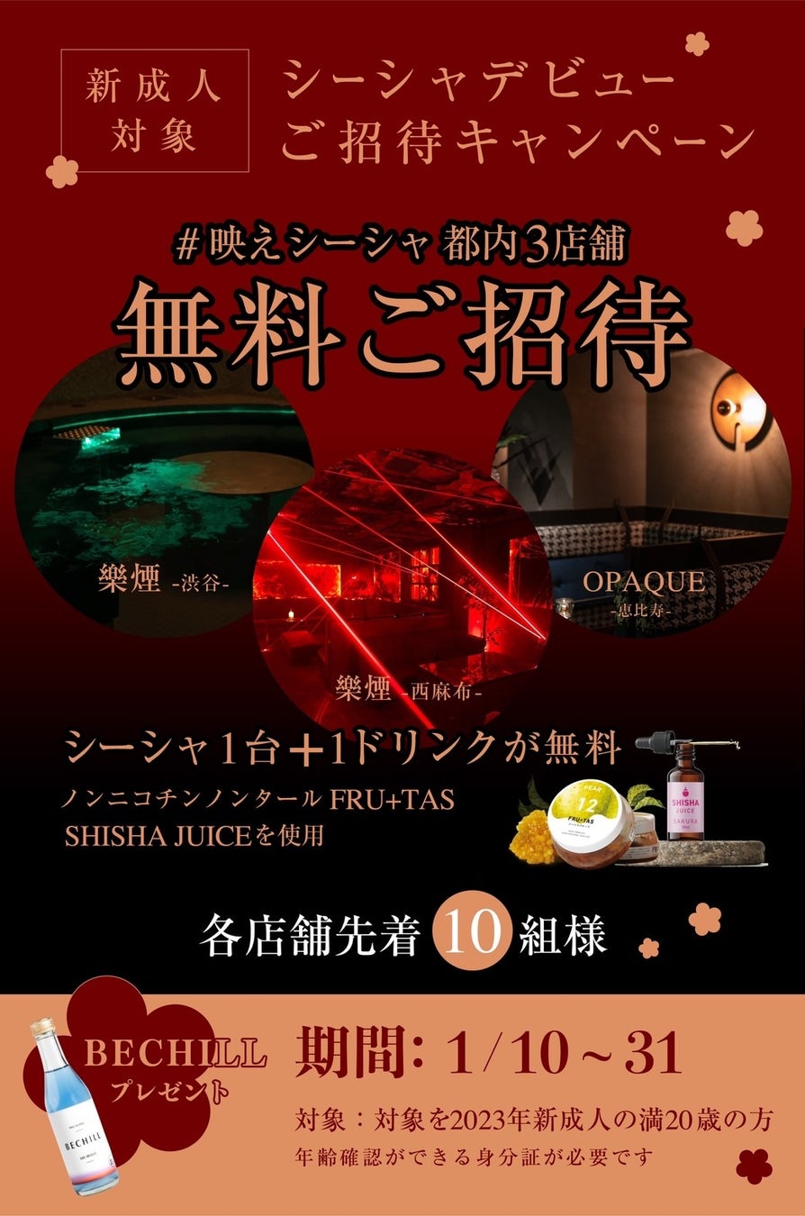 新成人のシーシャデビューを応援する都内随一の「#映えシーシャ」3店舗にご協力いただき、シーシャを無償でご提供いたします。いきなりシーシャは怖いという方も安心!生のフルーツを使用したノンニコチン/ノンタールのフレーバー「FRU+TAS」(https://fru-tas.com/)とシーシャの味を加速させる「SHISHA JUICE」(https://mobile.twitter.com/shisha_juice)を使用したシーシャをご提供いたします。さらにドリンクは飲むサウナで話題のCBDアルコール飲料「BECHILL」(https://bechill.jp/)を無料でご提供いたします。