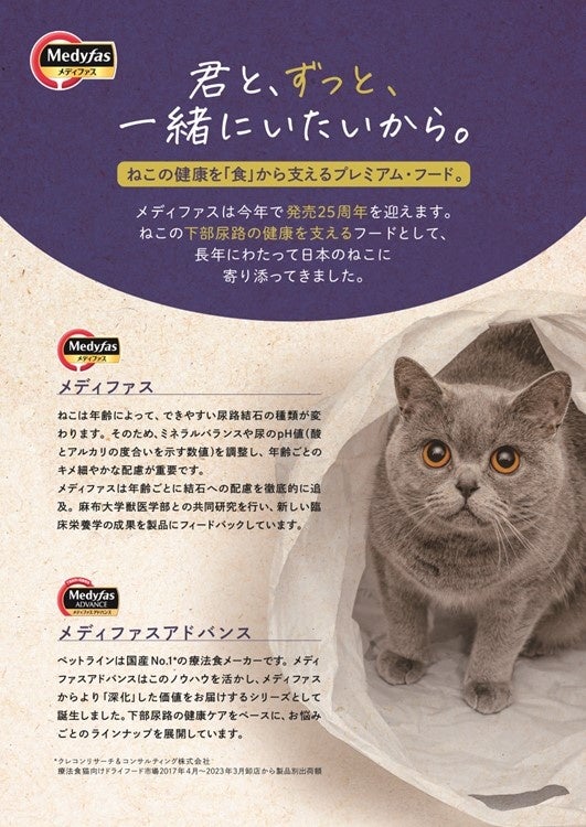 君と、ずっと、 一緒にいたいから。メディファスは、「年齢」と「生活習慣」で選ぶ、下部尿路の健康ケアをベースにしたプレミアム・フードです。1998年に日本で初めての下部尿路ケアに特化したブランドとして誕生し、今年で発売25周年。猫の下部尿路の健康を支えるフードとして、長年にわたって日本のねこちゃんに寄り添ってきました。