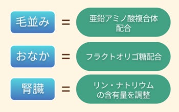 亜鉛アミノ酸複合体、フラクトオリゴ糖を配合し、リン・ナトリウム含有量を調整する事で、シニア期の気になる悩みにも配慮しています。