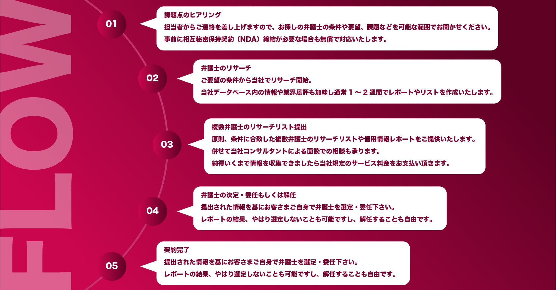 ご依頼を頂いた企業さまのご要望に基づき、業界で20年以上の実績と蓄積を持つ独自の弁護士データベースの中から、最適と思われる弁護士をリサーチしてリストアップしてご提供いたします。