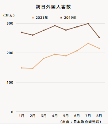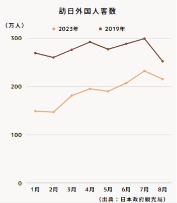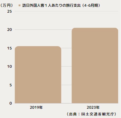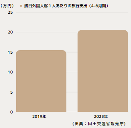 コロナ禍前の2019年同月(252万134人)比で85.6%にまで回復しています。 コロナ禍以前の訪日外国人客数に戻りつつあり、国土交通省観光庁によると、1人あたりの消費額も高水準で推移。2023年4~6月期の1人あたりの消費額は20.5万円で、コロナ禍前の2019年同月の15.5万円を大きく上回りました。これは、円安が後押しし、外国人観光客にとって訪日が、格安になっていることも背景にあると考えます。