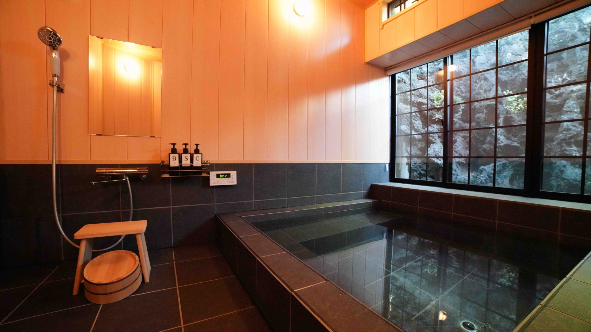 庭の池を眺めながら、ゆったり入れる室内風呂も完備。