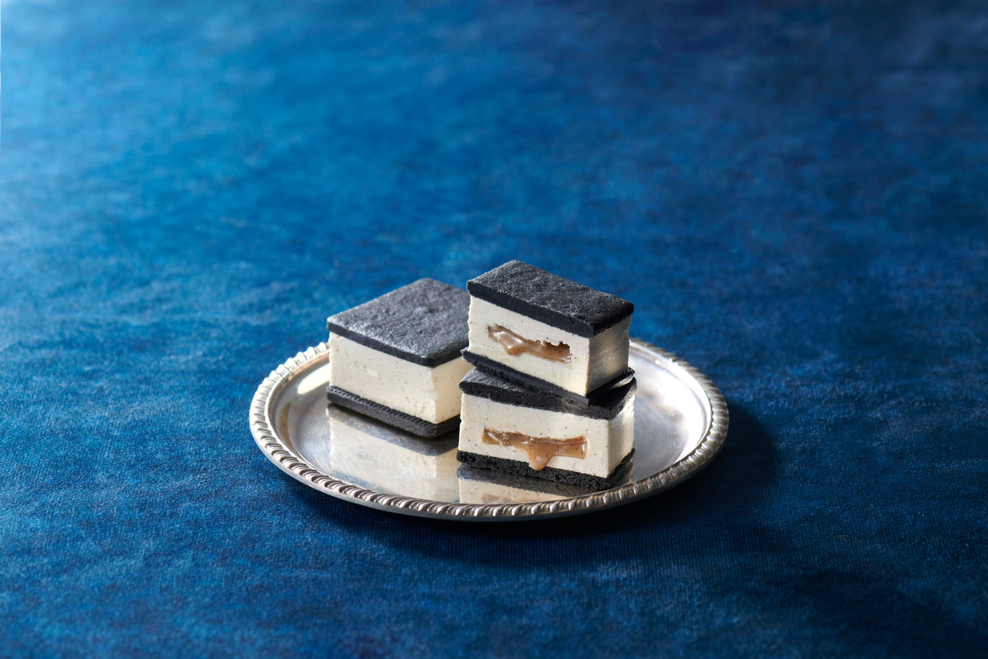 竹炭を練り込んだサブレでバタークリームをサンドしています。タヒチ種のバニラを使用したバタークリームには自社のバニラブランデーを香らせ、 中にはトロっとした少し塩味の効いたバニラジャムを閉じ込めました。バニラの香りを存分にお楽しみいただける贅沢なバターサンドです。